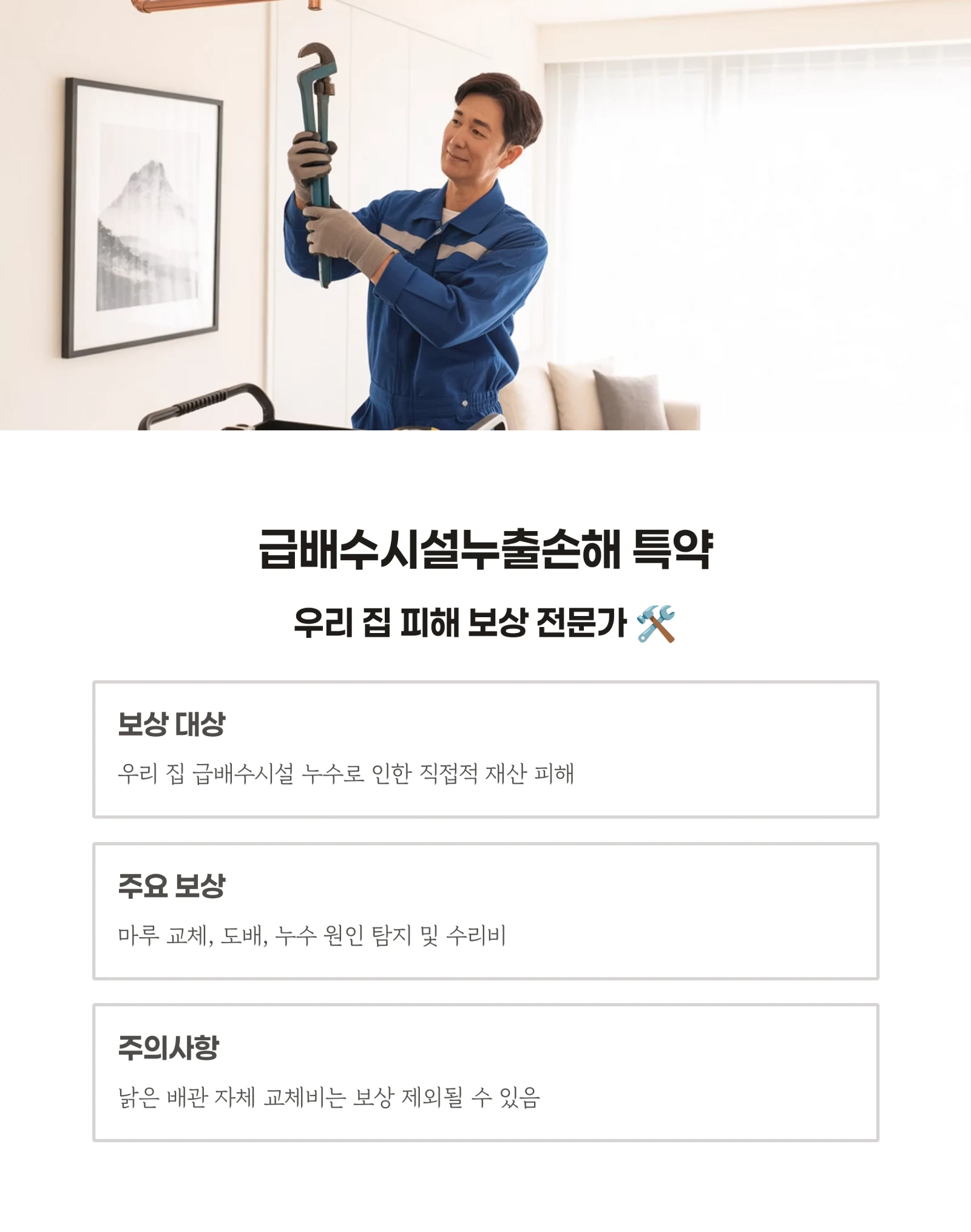 | 핵심 포인트 | 우리 집 피해는 보상 불가! | 노후 배관 자체 교체비는 보상 어려움. |