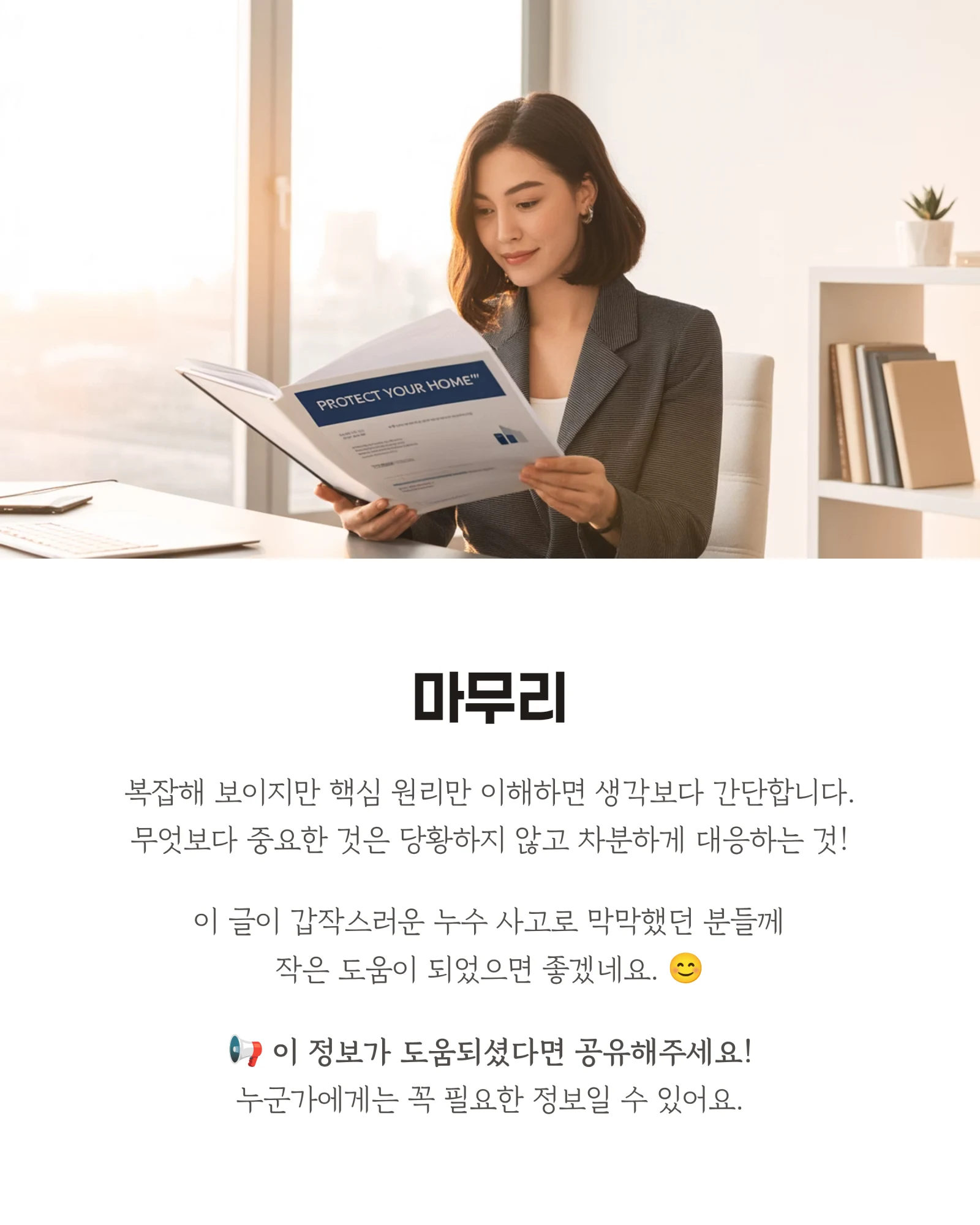 이 글이 갑작스러운 누수 사고로 막막했던 분들께 작은 도움이 되었으면 좋겠네요. 더 궁금한 점이 있다면 언제든지 댓글로 물어봐주세요! 😊