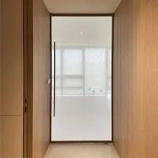 - 장점: 내부가 직접적으로 보이지 않아 사생활을 보호하면서도 빛을 은은하게 투과시켜 현관을 따뜻하고 고급스러운 공간으로 만듭니다. 유리가 깨져도 파편이 튀거나 흩어지지 않아 안전합니다.