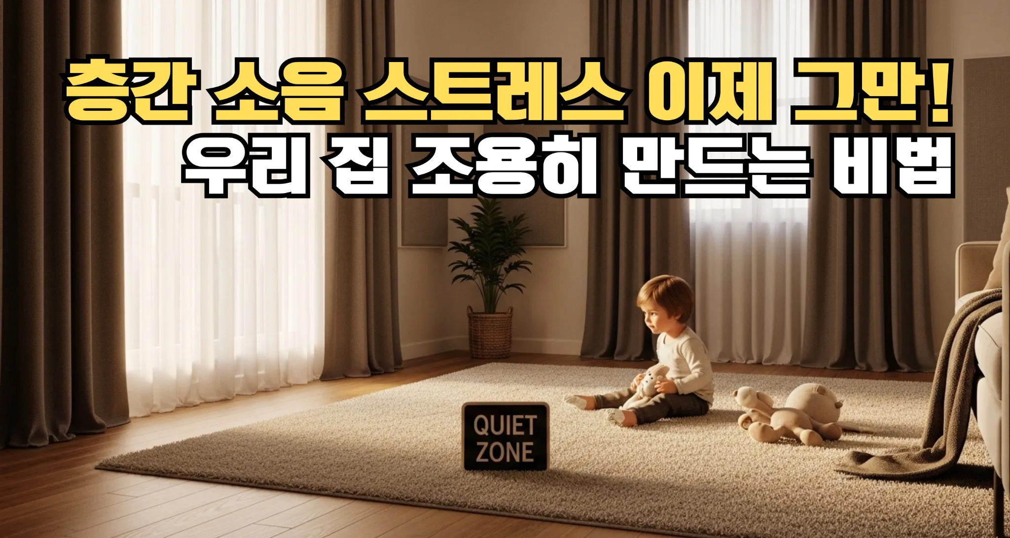 조용한 거실에서 아이가 카펫 위에 앉아 있는 모습, 소음 차단을 위한 커튼과 러그가 강조된 공간
