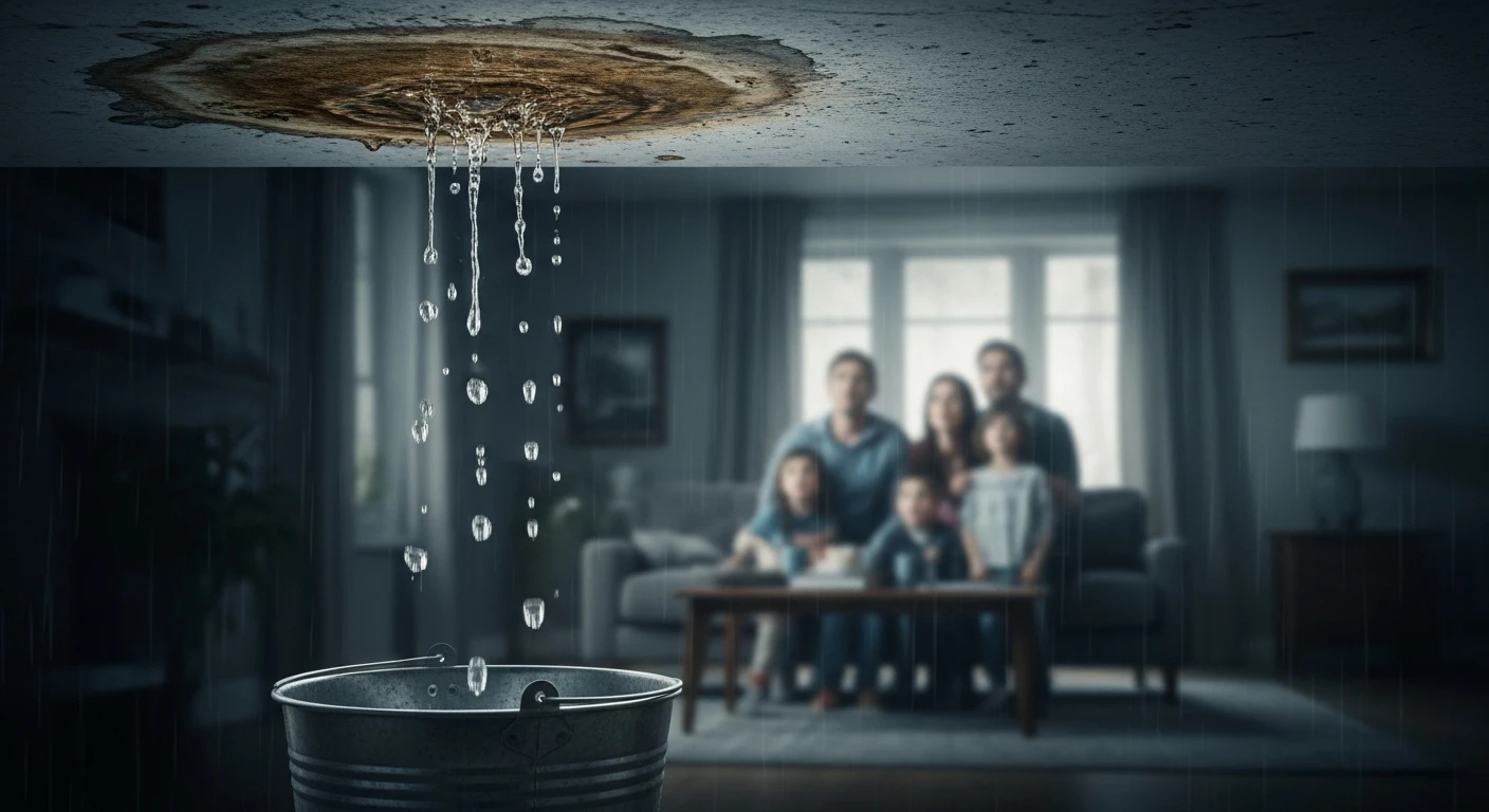 천장에 생긴 물 얼룩에서 물방울이 떨어져 양동이에 떨어지고 있는 모습과 흐릿하게 배경에 소파에 앉아 이 가족을 바라보는 듯한 가족 단란한 모습이 함께 보이는 거실 풍경