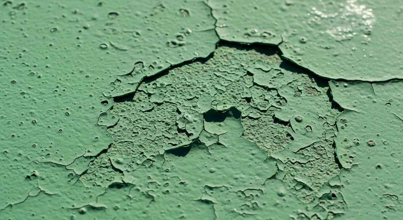 녹색 페인트가 균열과 박리로 들려 일부분이 떨어져 나간 거친 표면의 클로즈업