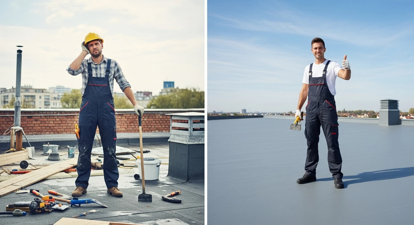 왼쪽은 건축 현장에서 초조한 표정으로 헤드 헬멧을 만진 작업자, 오른쪽은 같은 작업자가 방수 코팅된 평평한 지붕 위에서 엄지손가락을 들어 올리며 자신감 있는 모습으로 서 있는 전후 비교 장면