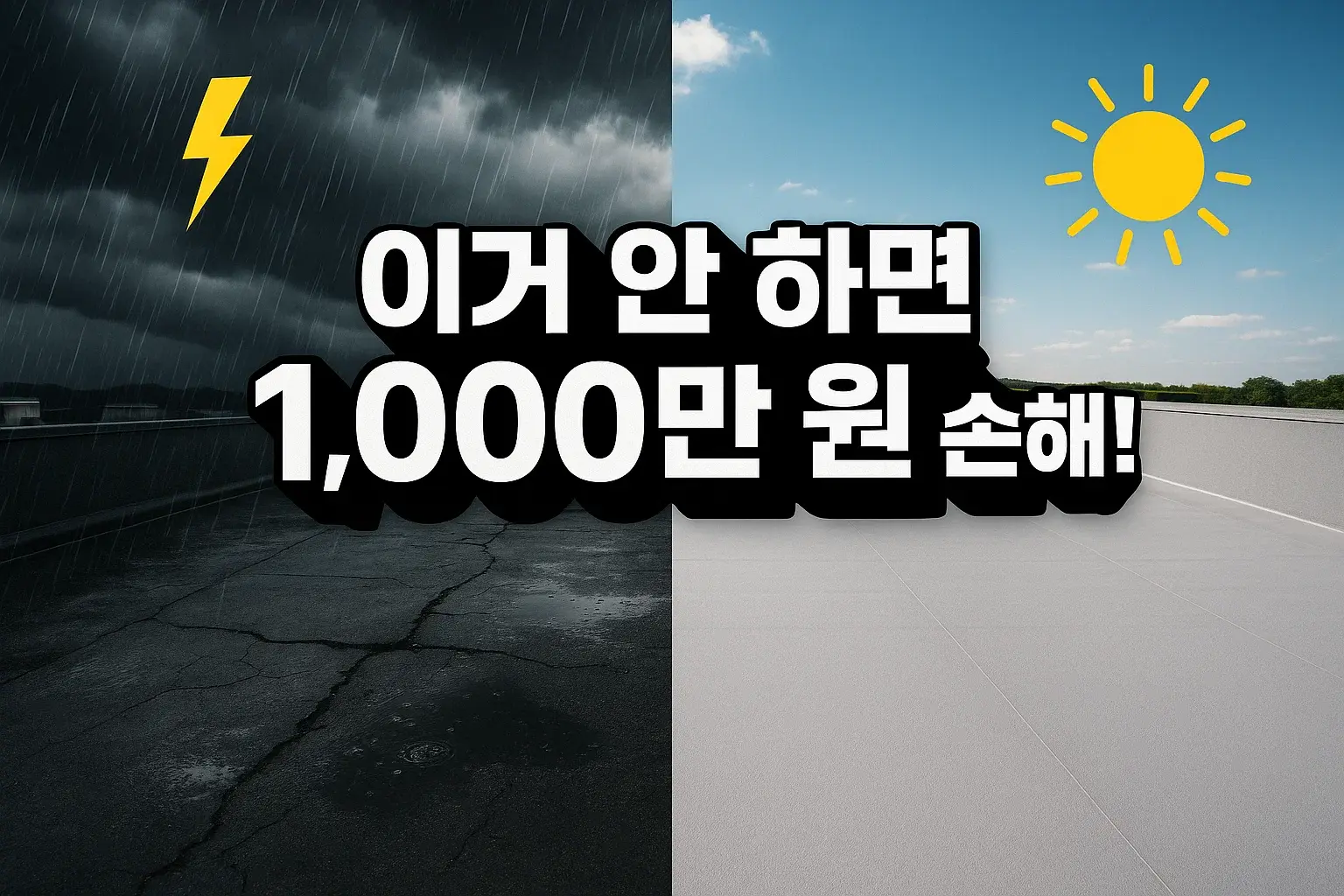 이미지가 2등분되어 왼쪽은 폭우와 번개가 치는 어두운 지붕 표면, 오른쪽은 맑은 날씨의 밝은 지붕 표면이 대비되는 장면. 중앙에는 굵은 흰색 글씨로 ‘이거 안 하면 1,000만 원 손해!’ 문구가 검은 테두리 배경 위에 배치되어 있음