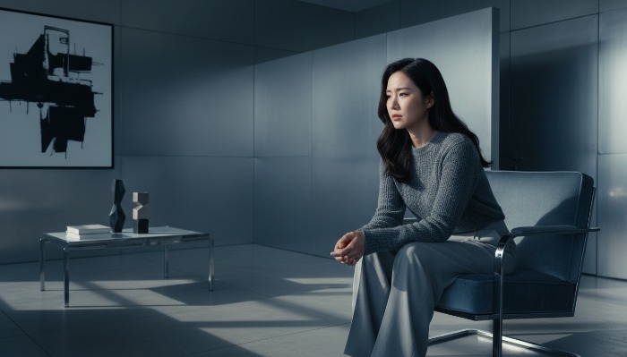 차가운 금속 소재의 미드센추리 모던 거실에서 혼자 생각에 잠겨 있는 한국인 여성의 모습
