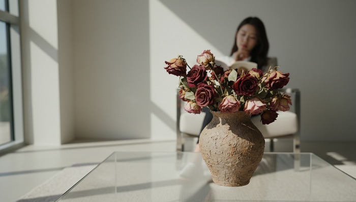 모던한 유리 테이블 위에 놓인 투박한 도자기 화병과 말린 장미 꽃다발