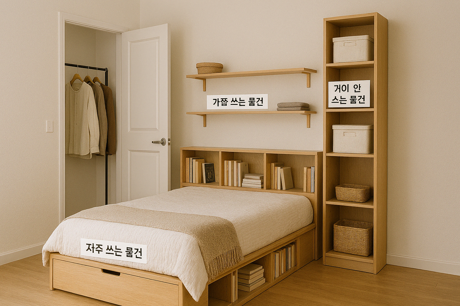 - 침대 밑 공간: 박스나 바구니를 놓아 계절 옷이나 이불 보관