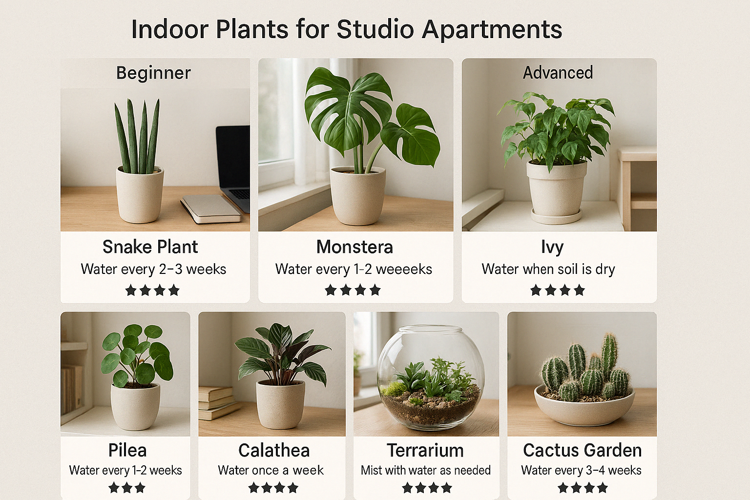 | 초보자용 ★☆☆ | 스투키, 산세베리아, 몬스테라 | 물 주기를 깜빡해도 잘 견디는 강인한 식물들 |