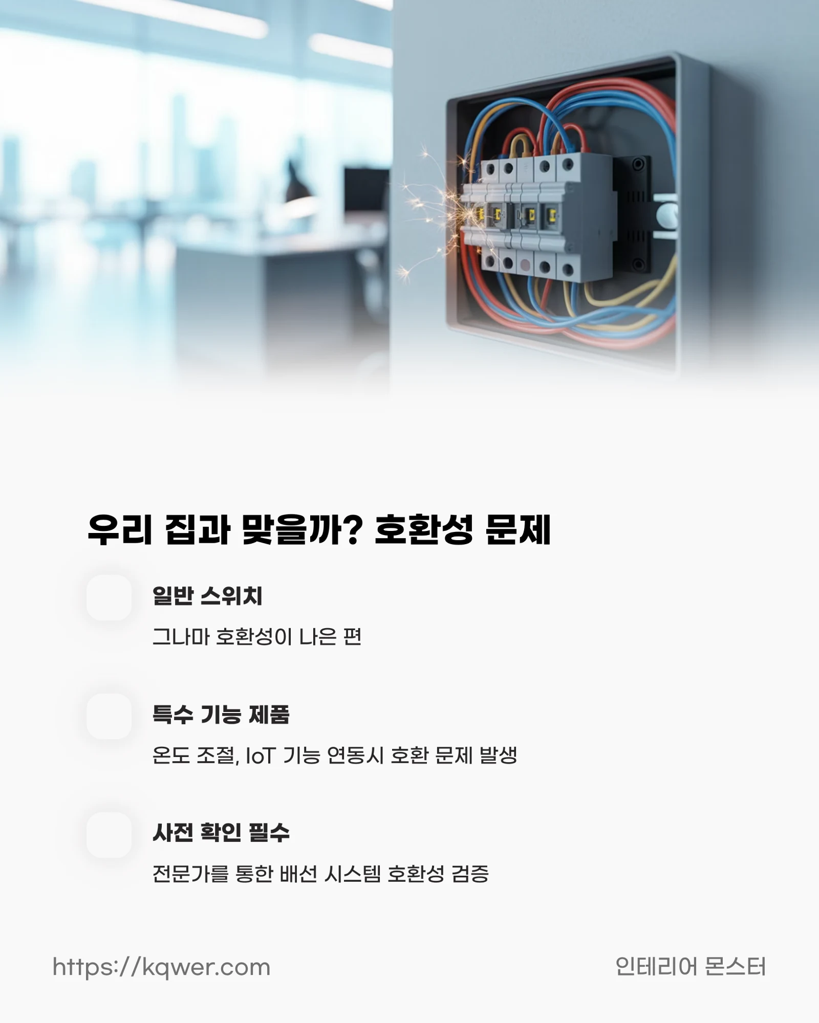 이런 비극을 피하려면 구매 전 전문가를 통해 현재 우리 집 배선 시스템과 구매하려는 융 스위치 모델의 호환성을 반드시, 두 번, 세 번 확인해야 합니다.