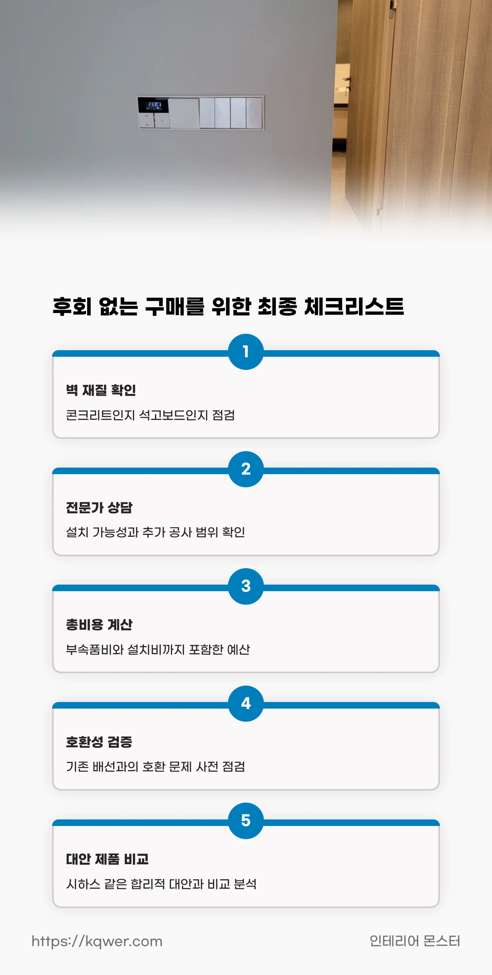 둘째, 반드시 인테리어 업체나 전기 전문가에게 설치 가능 여부와 추가 공사 범위를 상담받아야 합니다.