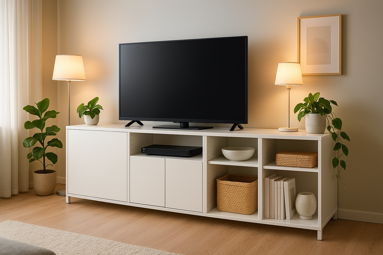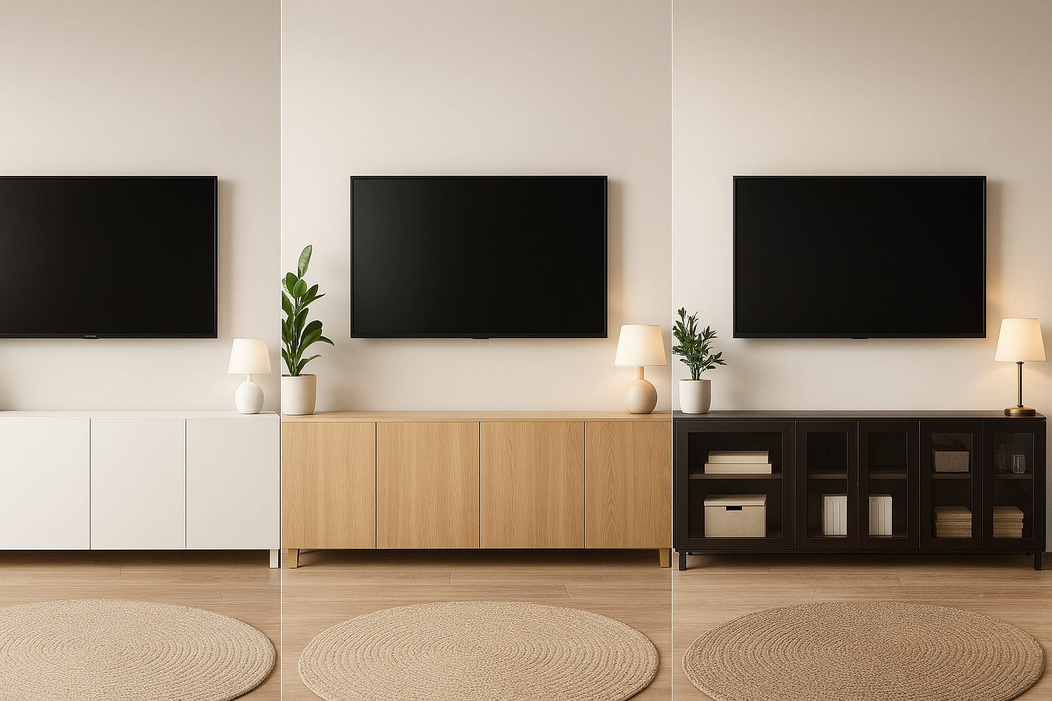기본은 TV 벽면 전체를 베스토로 통합하는 방식. 중앙엔 TV, 좌우는 베스토 수납장 2단 배치. 아래쪽엔 3칸짜리 모듈을 추가해 리듬감과 장식 효과까지 챙깁니다.
