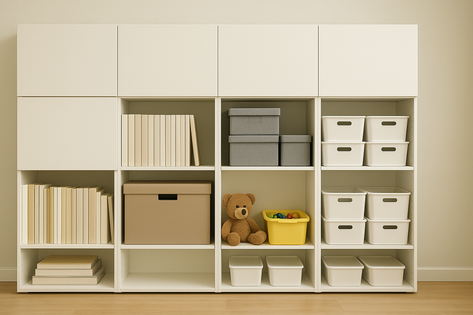 - 다용도 수납: 놀이, 책, 장식 각각 분리해 정리