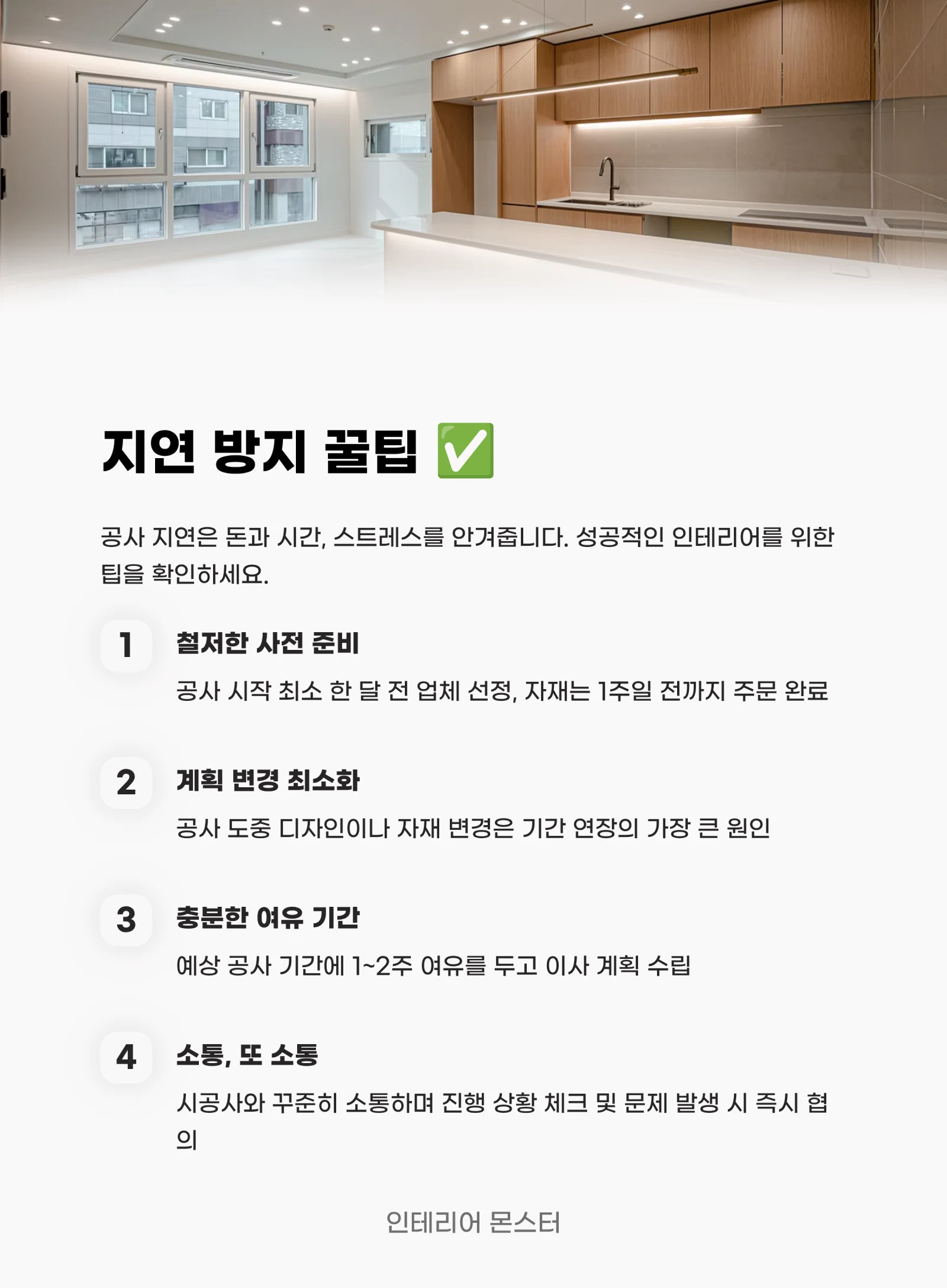 성공적인 인테리어를 위해 공사 기간 지연을 막는 몇 가지 팁을 알려드릴게요.