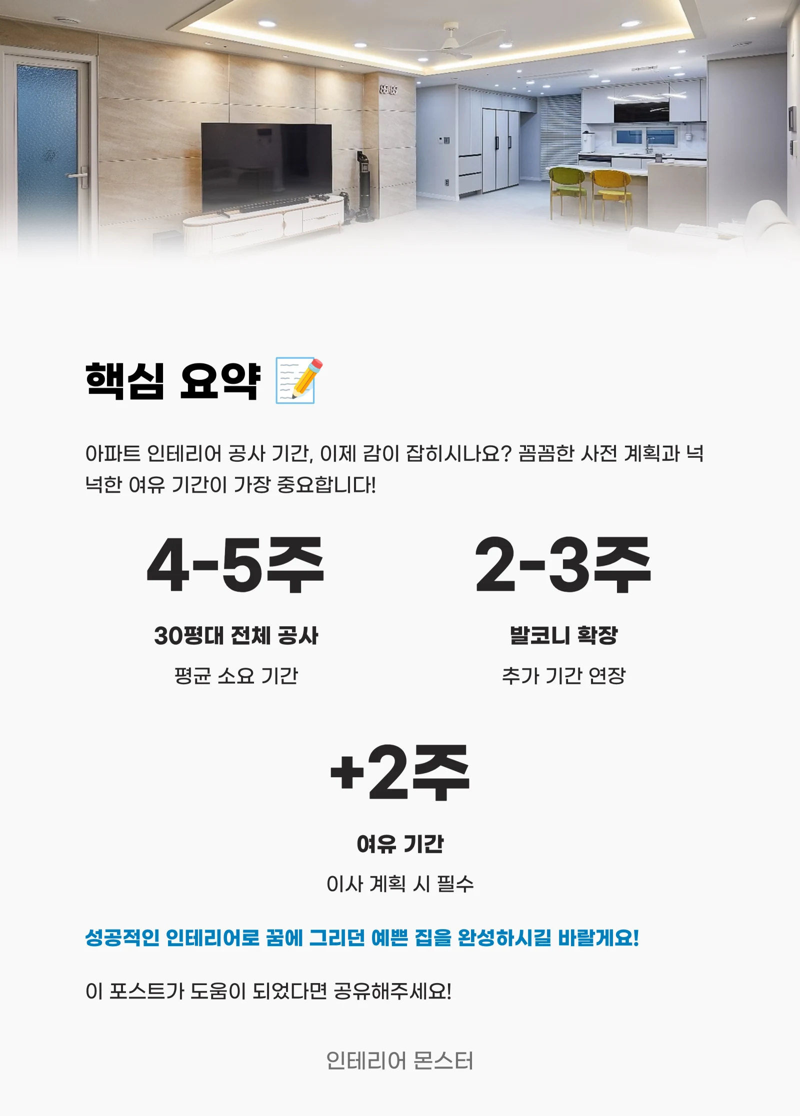 위 기간은 일반적인 기준이며, 아파트 상태나 공사 범위, 자재 수급 상황에 따라 얼마든지 변경될 수 있어요. 어디까지나 참고용으로만 생각해주세요!