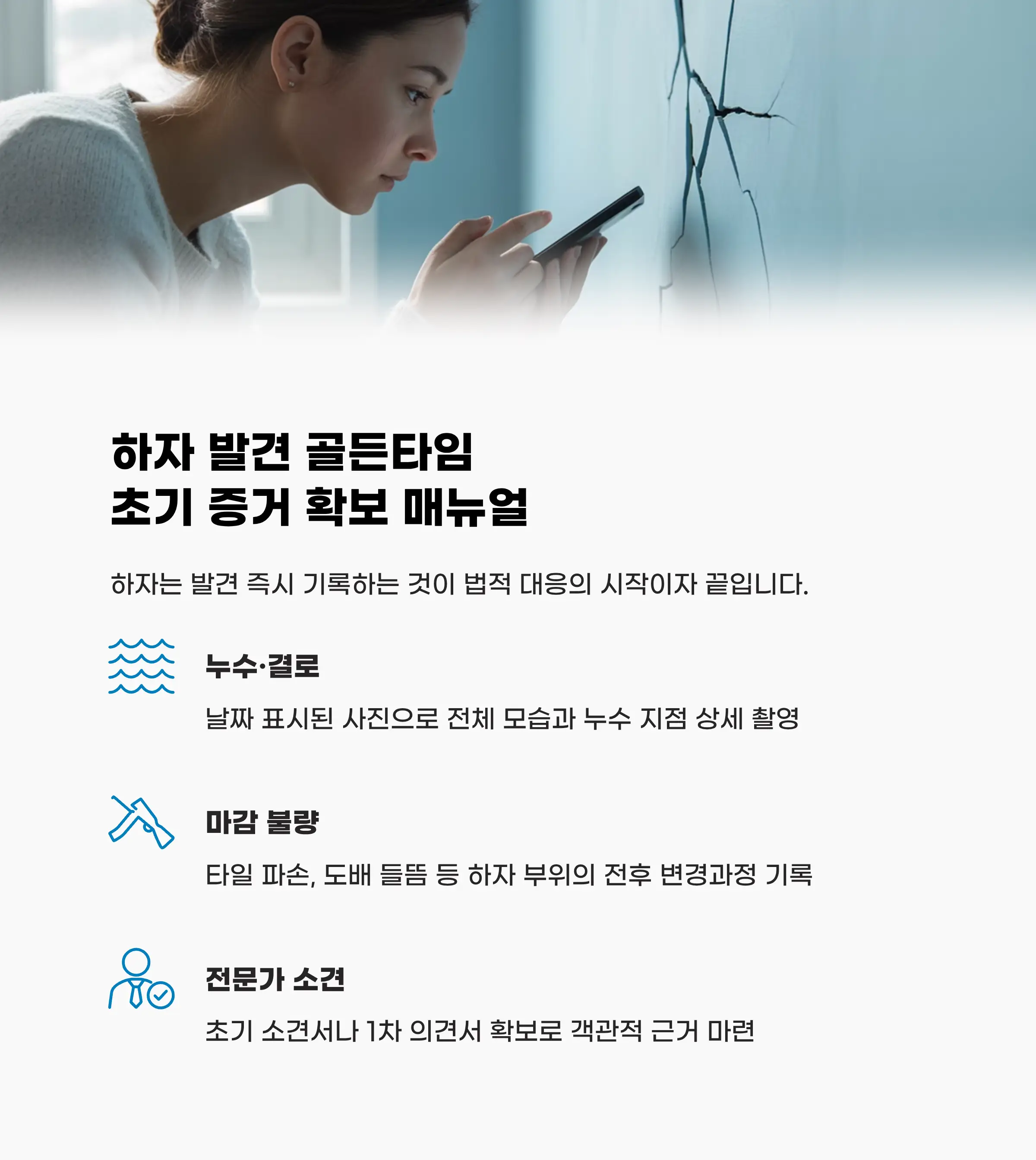 하자는 발견 즉시 기록하는 것이 법적 대응의 시작이자 끝입니다. 골든타임을 놓치면 입증이 어려워집니다.