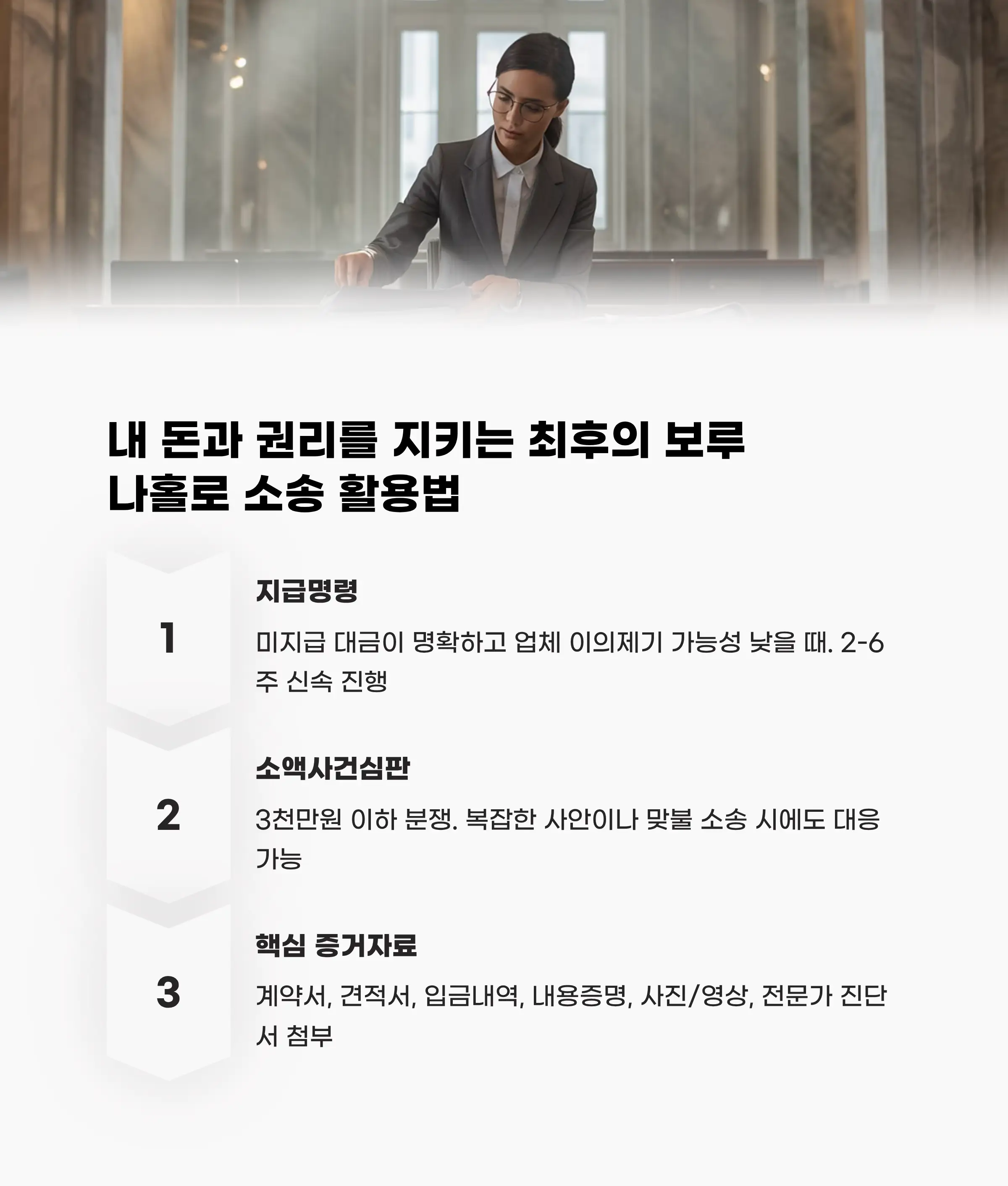 분쟁 금액이 명확하고 상대방이 명백히 책임을 회피할 경우, '지급명령'이나 '소액사건심판'을 활용하여 나홀로 소송을 진행할 수 있습니다.