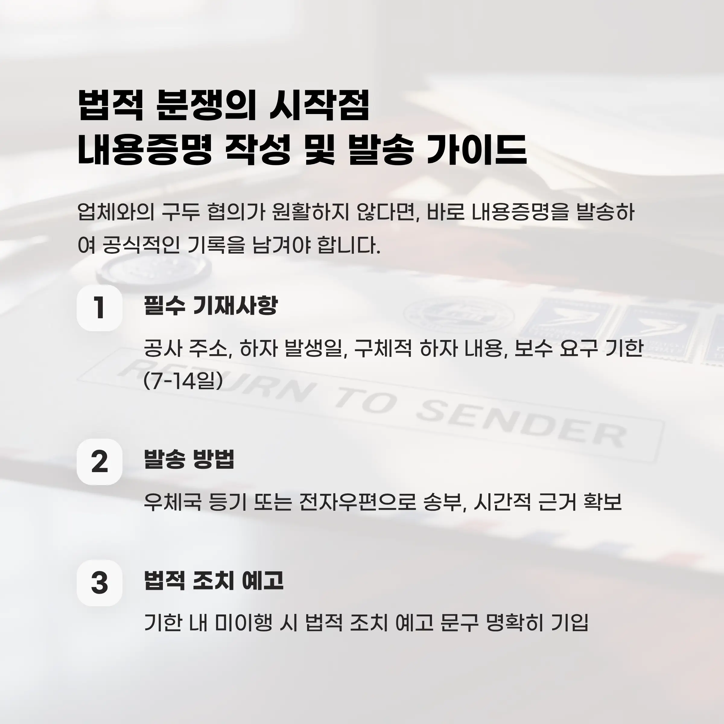 내용증명에는 공사 주소, 하자가 발생한 날짜, 구체적인 하자 내용, 보수를 요구하는 기한(통상 7일~14일), 그리고 기한 내 미이행 시 법적 조치를 예고하는 문구를 명확하게 기입해야 합니다.