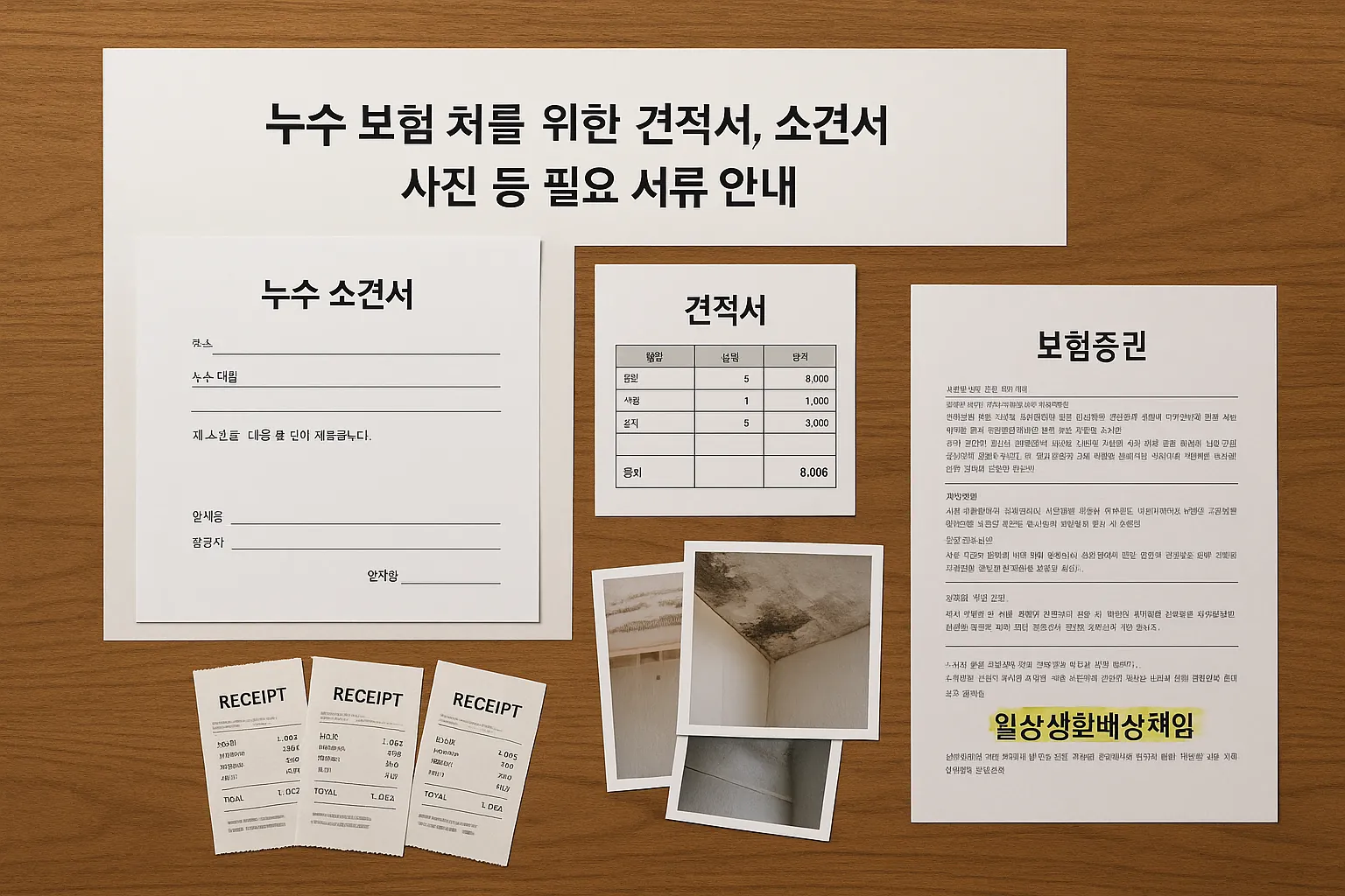 - 서류: 누수 원인 소견서, 상세 견적서, 영수증(세금계산서), 이체 내역서