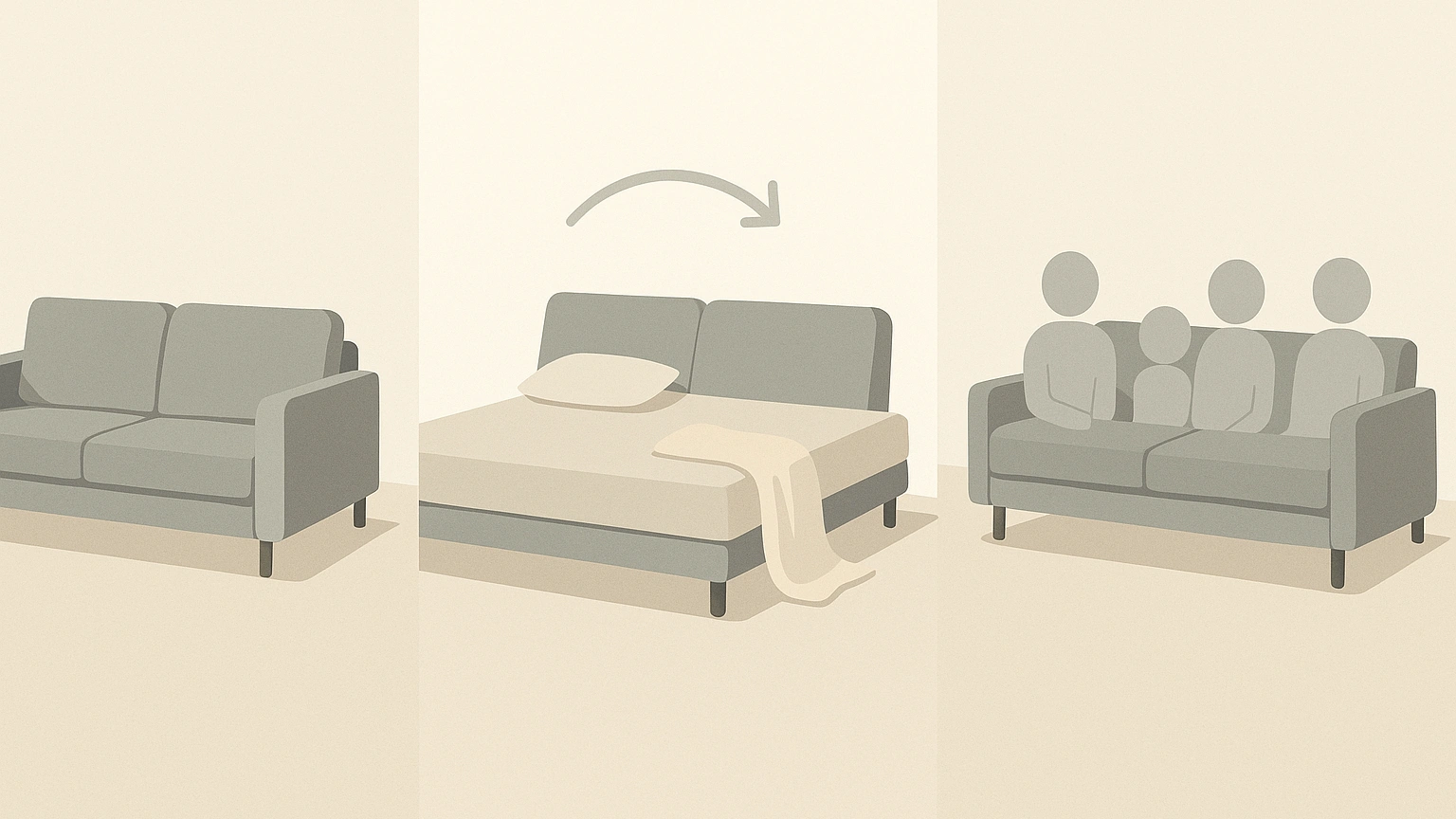 1인 가구를 위한 다기능 그레이 패브릭 소파의 다양한 활용(좌석, 침대, 손님용 좌석)을 보여주는 컨셉 인포그래픽