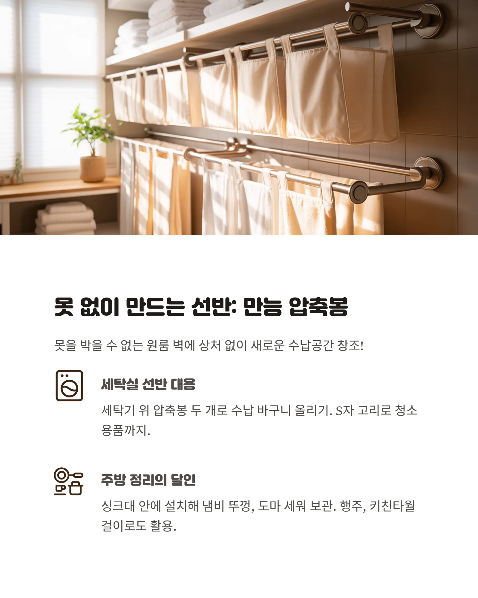 - 세탁실 선반 대용: 세탁기 위쪽 허전한 공간에 압축봉 두어 개를 나란히 설치하고 그 위에 가벼운 수납 바구니를 올려보세요. 훌륭한 선반이 탄생합니다. S자 고리를 걸어 청소용품을 걸어두기에도 좋아요.