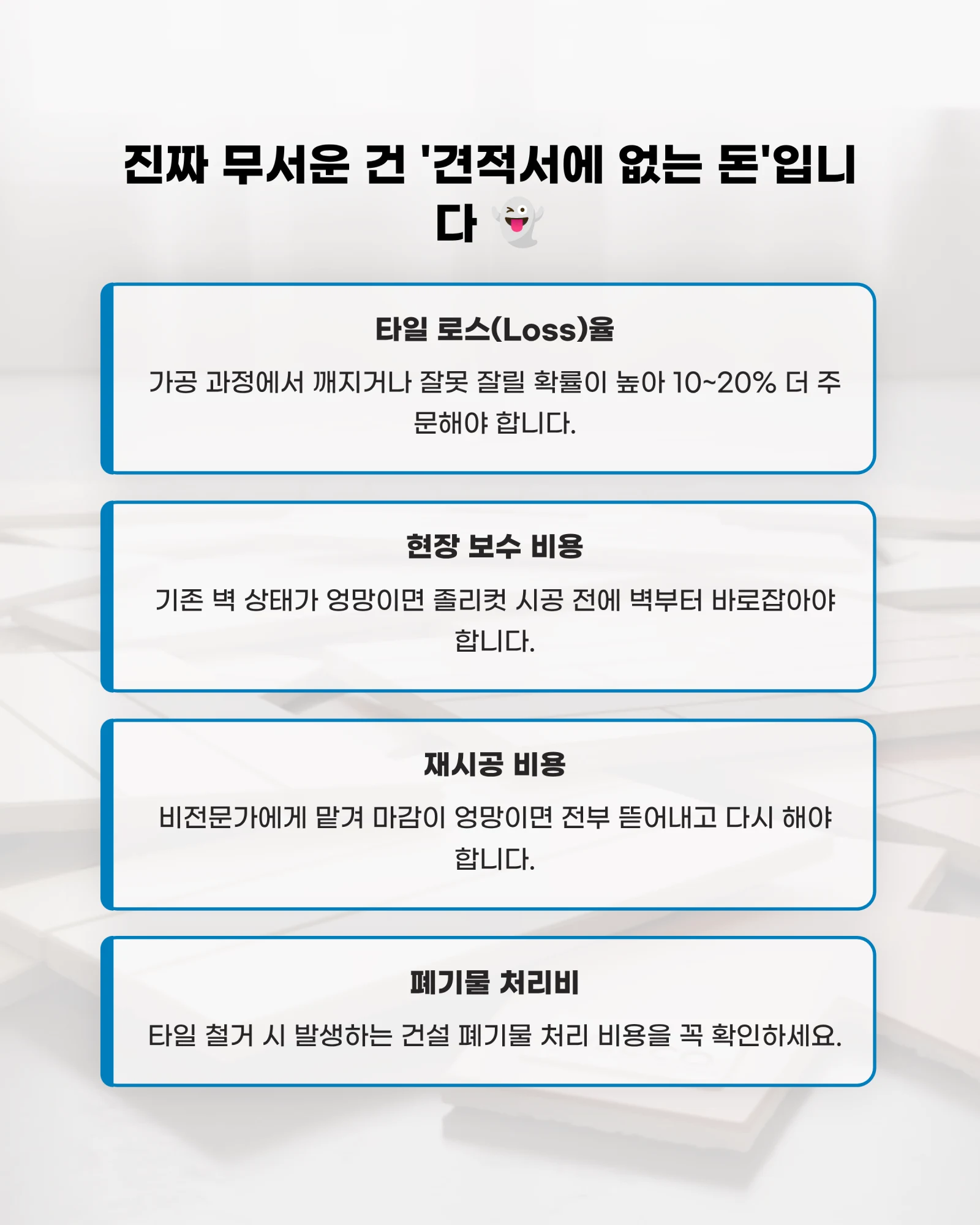 졸리컷 시공 시 예상치 못한 추가 비용이 발생할 수 있습니다. 타일 로스율, 현장 보수, 재시공, 폐기물 처리 비용을 반드시 확인해야 합니다.