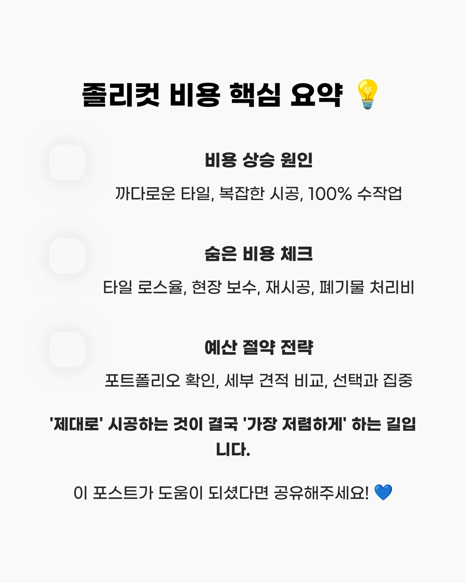 졸리컷 시공 시 예상치 못한 추가 비용이 발생할 수 있습니다. 타일 로스율, 현장 보수, 재시공, 폐기물 처리 비용을 반드시 확인해야 합니다.