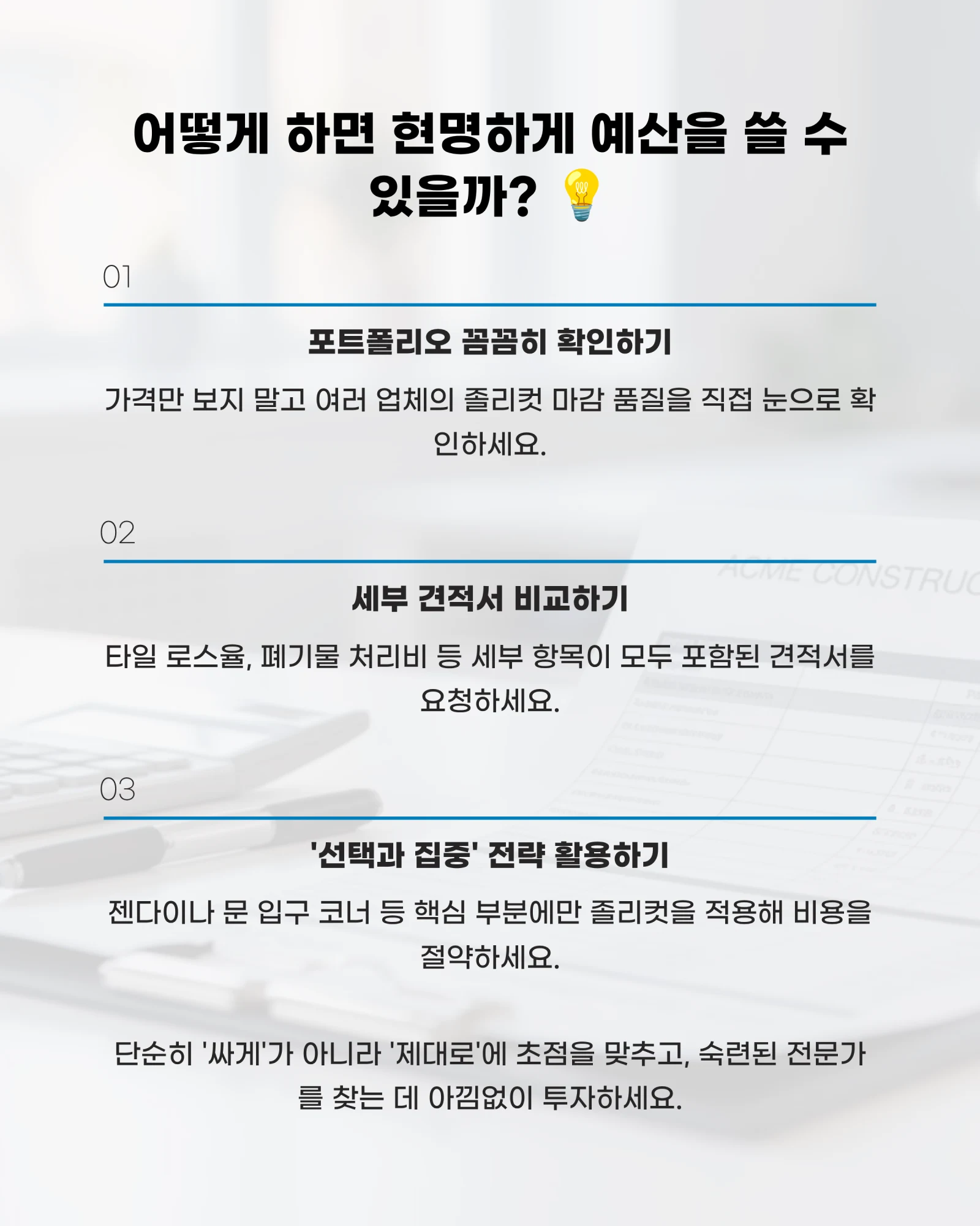 • 세부 견적서 비교하기: '졸리컷 시공 일체'처럼 뭉뚱그린 견적은 피하세요. 타일 로스율, 폐기물 처리비 등 세부 항목이 모두 포함된 견적서를 요청해서 꼼꼼히 비교해야 합니다.
