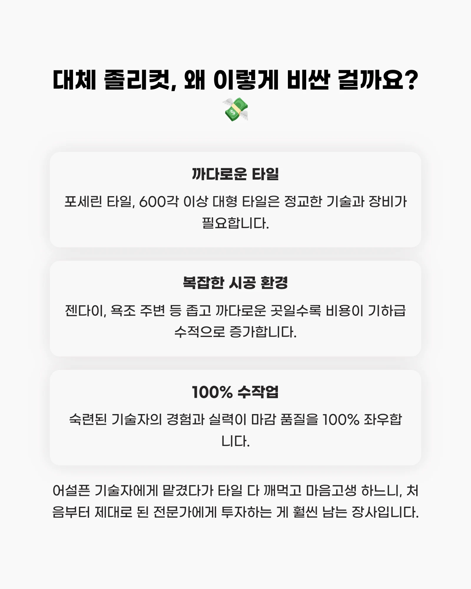 어설픈 기술자에게 맡겼다가 타일 다 깨먹고 마음고생 하느니, 처음부터 제대로 된 전문가에게 투자하는 게 훨씬 남는 장사라는 걸 꼭 기억하셔야 합니다.