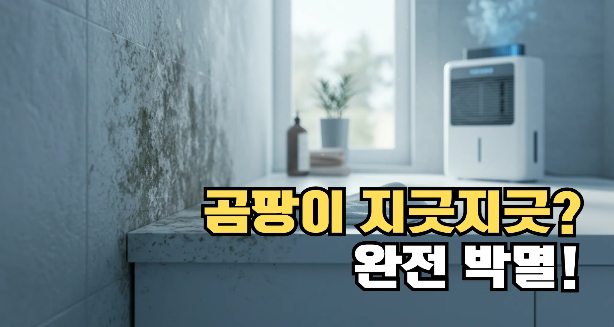 타일 벽면에 곰팡이가 핀 욕실 모습과 함께 곰팡이 제거 팁을 강조한 썸네일 이미지