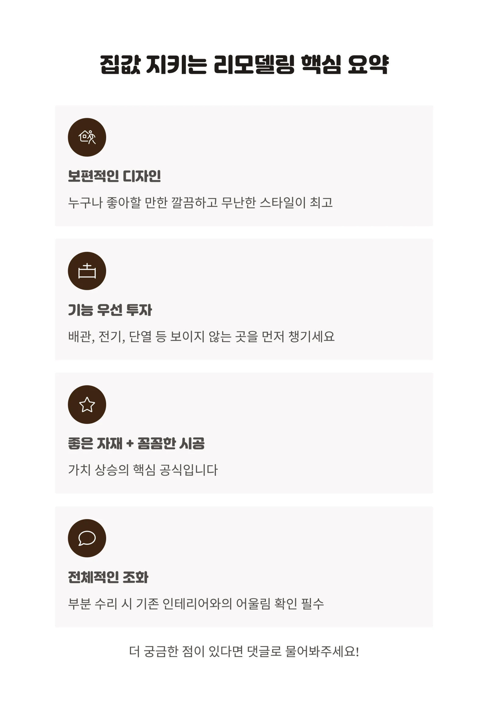 리모델링은 분명 우리 삶의 질을 높여주는 즐거운 과정입니다. 하지만 내 집의 가치까지 생각한다면, 조금 더 신중하고 전략적인 접근이 필요하겠죠?