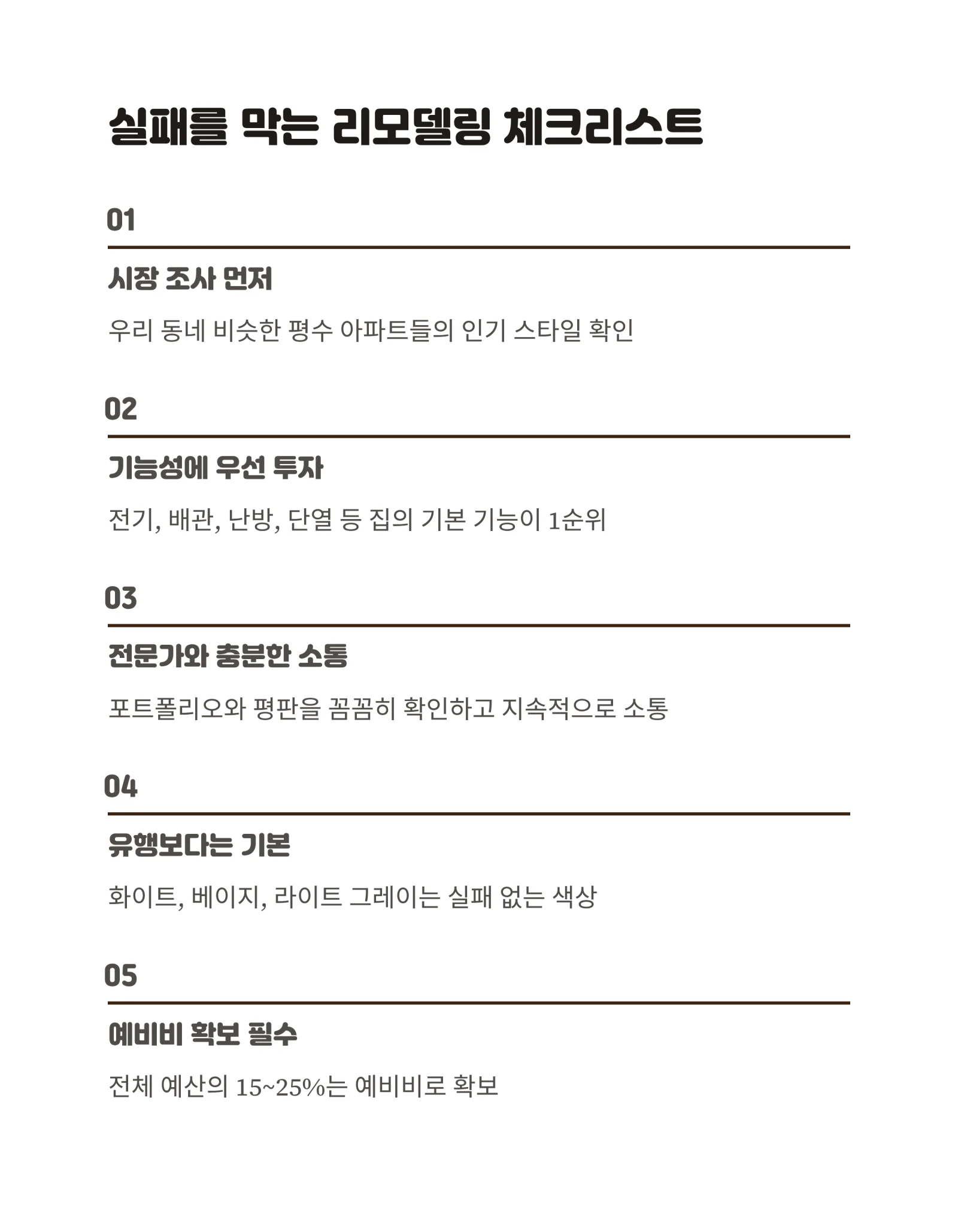 - 시장 조사 먼저: 우리 동네, 비슷한 평수 아파트들은 어떤 스타일이 인기 있는지 꼭 확인하세요. 과감한 시도보다는 대중적인 스타일이 안전합니다.
