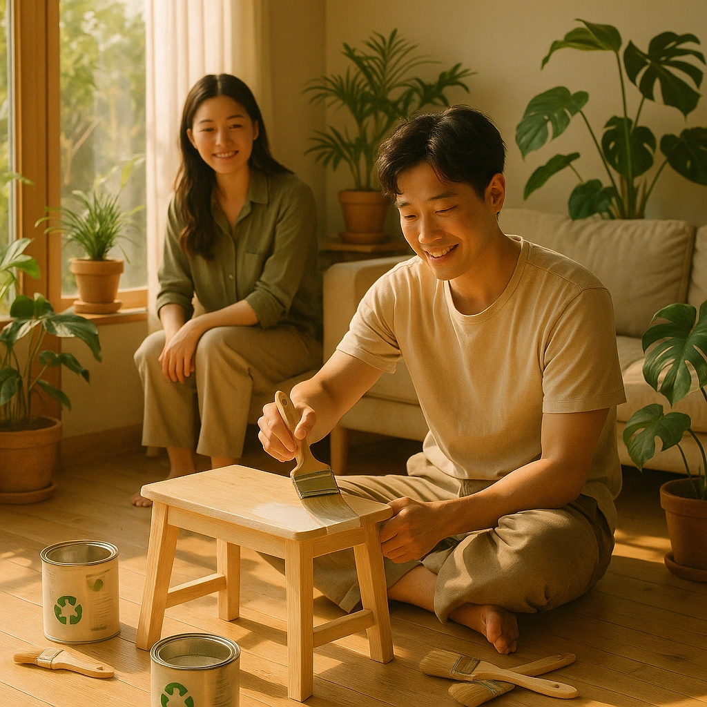 - 건강한 마감재 선택: 벽이나 가구에 페인트를 칠해야 한다면, VOCs(휘발성유기화합물) 함량이 낮은 친환경 페인트나 천연 페인트를 선택하는 것이 좋습니다. 벽지 역시 천연 소재나 재활용 소재로 만든 제품을 고려해볼 수 있어요. 최근에는 VOCs 함량이 낮은 페인트나 천연 소재 벽지처럼 건강까지 생각한 자재들이 많이 나오고 있어 선택의 폭이 넓어졌어요.