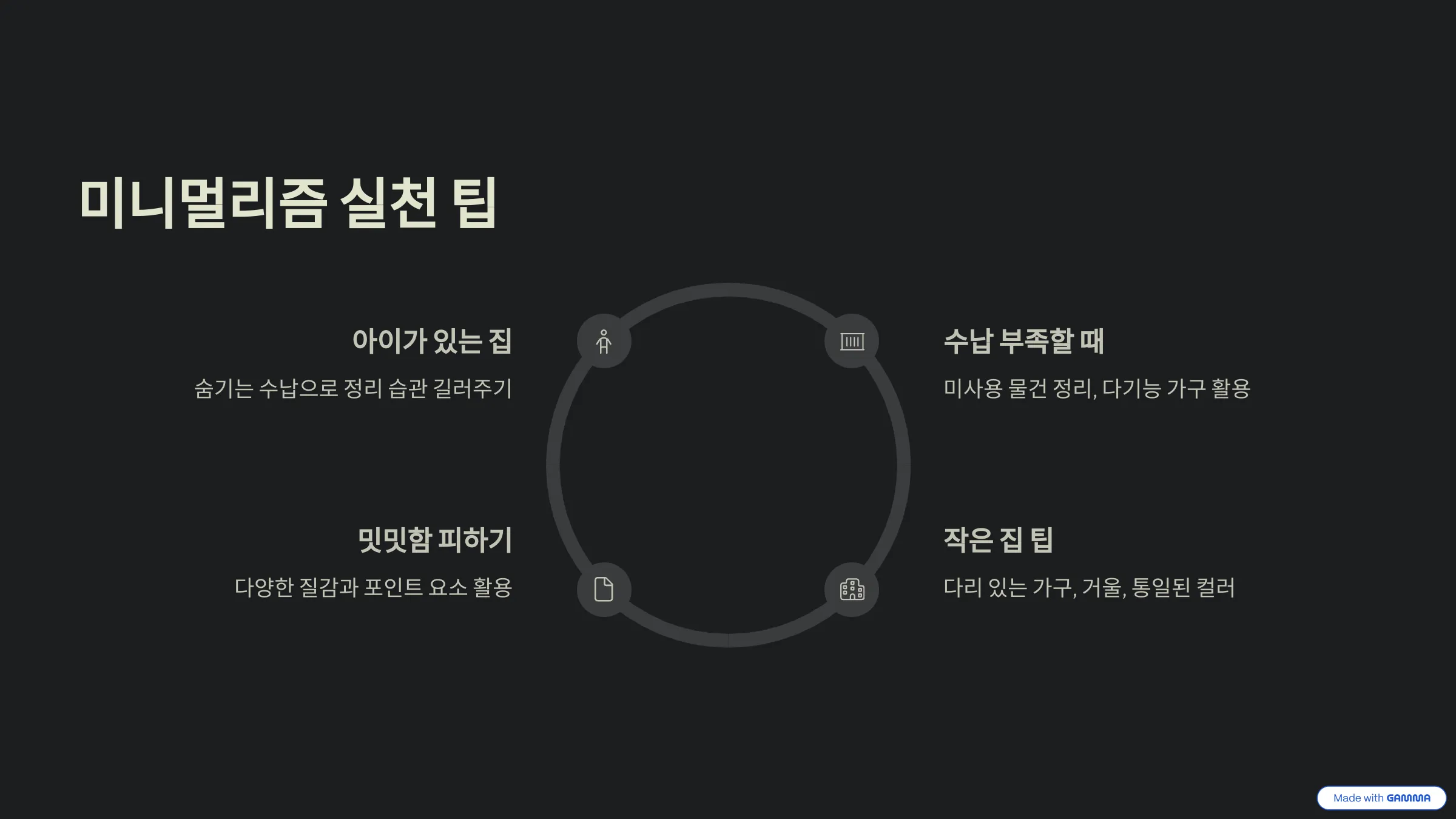 진정한 미니멀리즘은 텅 빈 집이 아니라, 내 마음을 가득 채우는 행복으로 가득한 집입니다. 불필요한 것들을 덜어낸 자리에, 당신의 취향이 담긴 조명 하나, 여행의 추억이 깃든 소품 하나, 그리고 사랑하는 사람과의 온기를 채워보세요. 집은 더 이상 잠만 자는 공간이 아닌, 나의 에너지를 충전하고 영감을 주는 소중한 안식처가 될 것입니다.