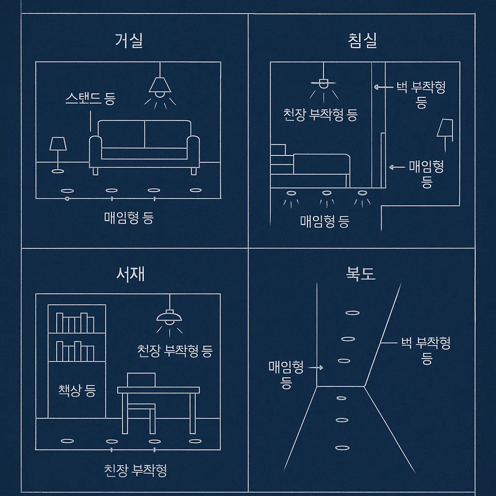 | 공간 | 핵심 목표 | 추천 조명 조합 | 배치 팁 |