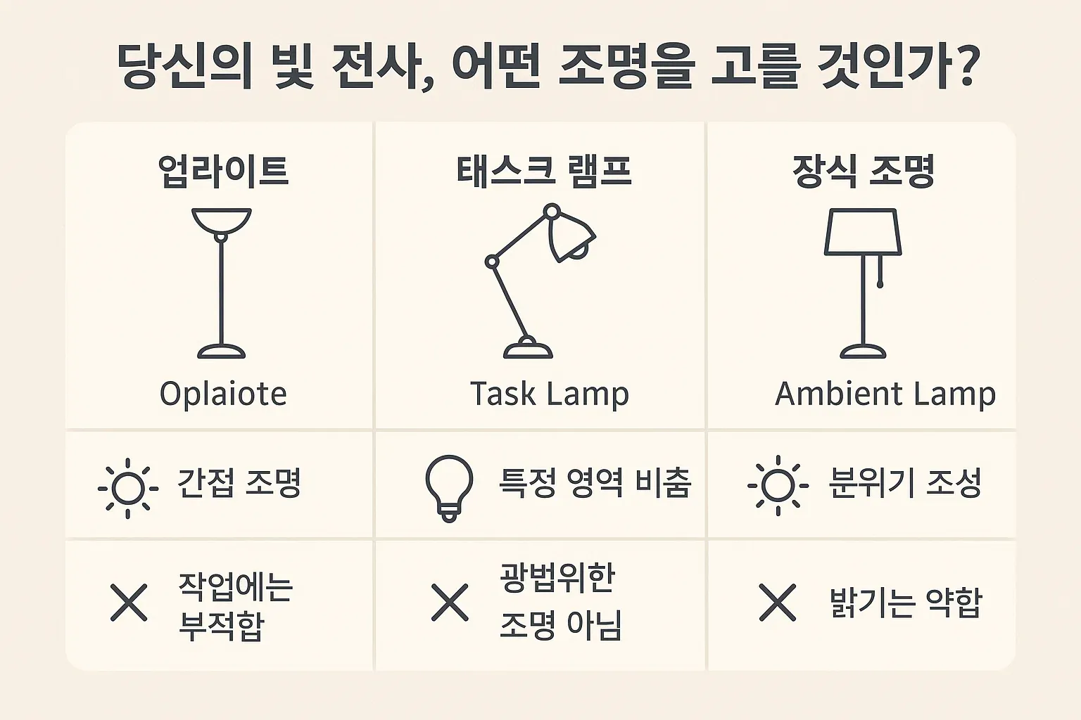 이 표를 보면 알 수 있듯, 하나의 조명만으로는 완벽한 승리를 거둘 수 없습니다. 업라이트형으로 전체적인 판을 밝히고, 태스크형으로 중요한 목표(책상, 소파)를 확보한 뒤, 장식형으로 허전한 공간에 온기를 더하는 입체적인 전략이 필요합니다.