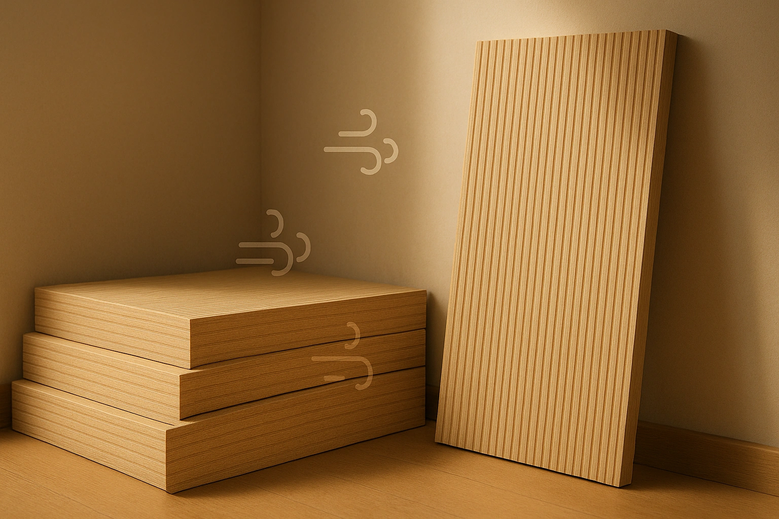 템바보드 시공 전, 재료가 실내 환경에 적응하는 과정을 상징적으로 표현한 이미지. 뒤틀림 방지 셀프 인테리어 팁.