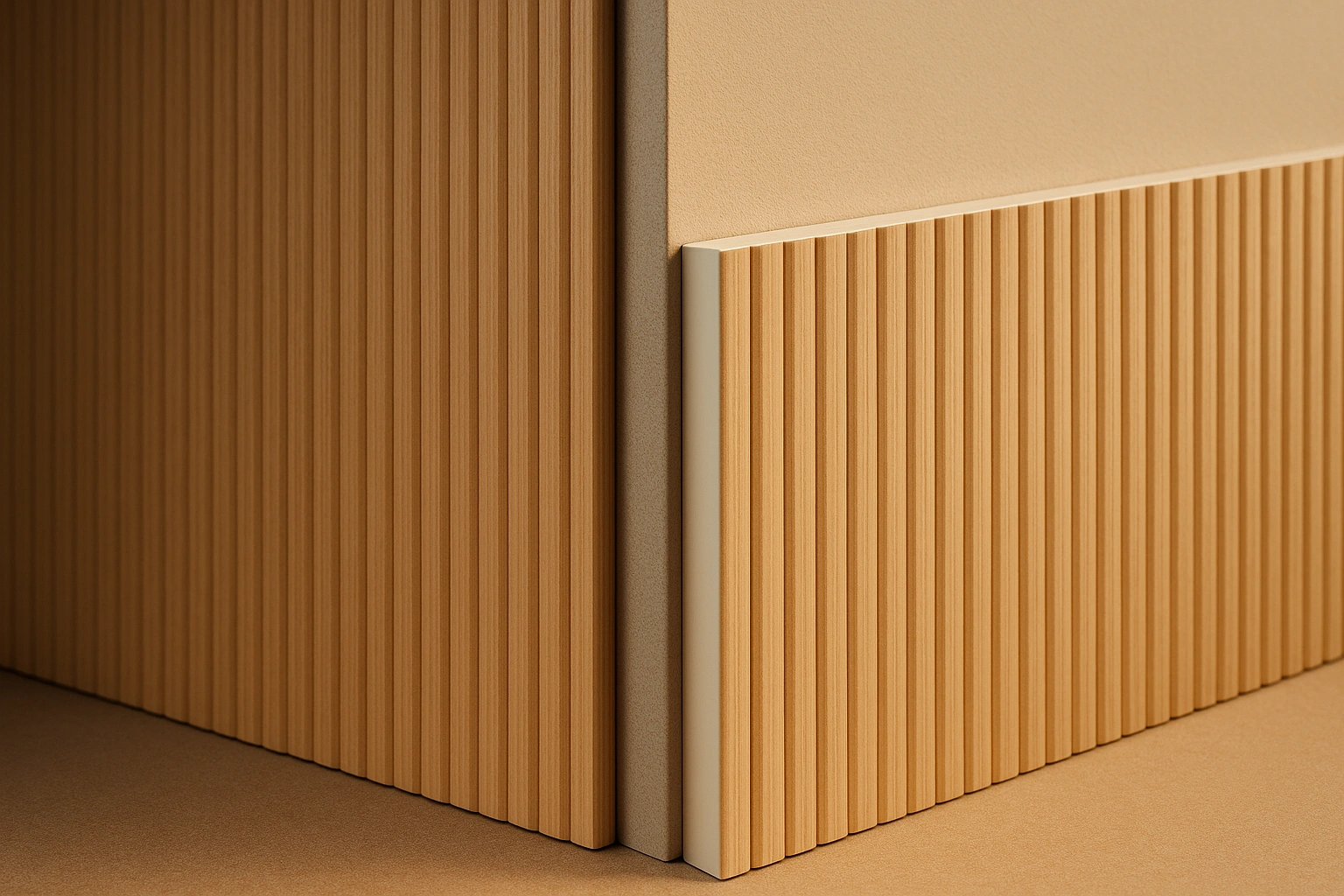 템바보드 코너에 디자인 몰딩을 적용하여 마감 완성도를 높이고 시공 오차를 보완하는 효과를 보여주는 이미지. 몰딩 활용법.