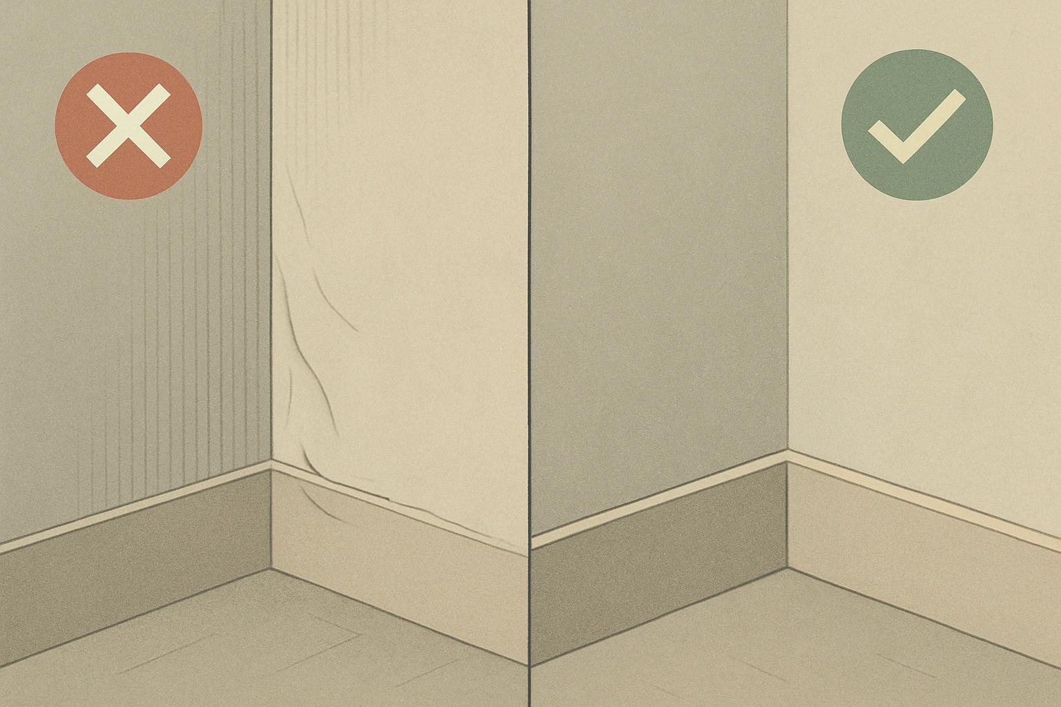 템바보드 코너 시공 시 잘못된 겹침 방식과 올바른 맞닿는 방식의 차이를 비교하는 인포그래픽. 마감 디테일 향상 팁.
