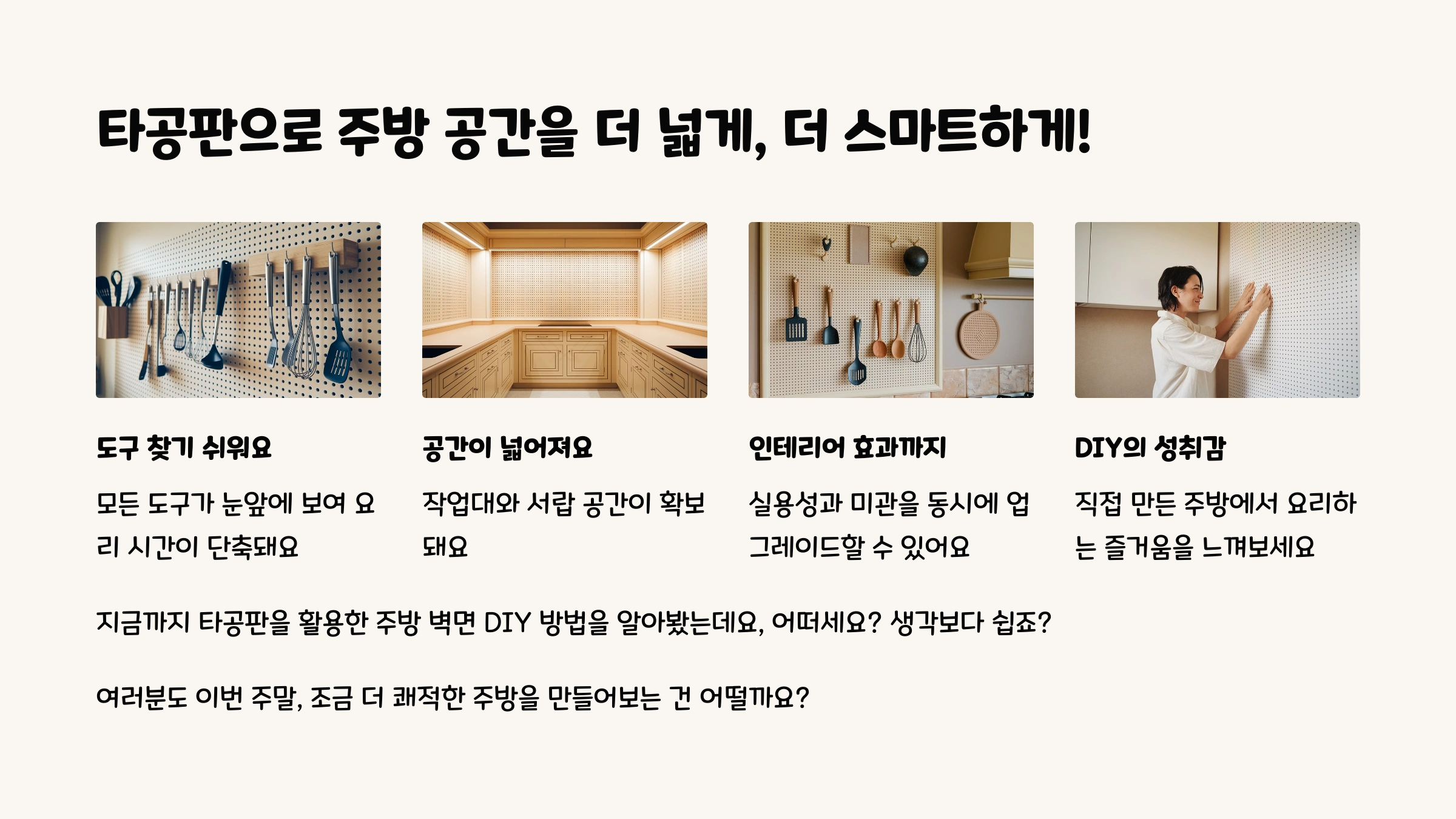 지금까지 타공판을 활용한 주방 벽면 DIY 방법을 알아봤는데요, 어떠세요? 생각보다 쉽죠? 저도 처음에는 '내가 과연 할 수 있을까?' 고민했었는데, 막상 해보니 주말 하루면 충분했답니다. 그리고 완성된 타공판 주방 벽을 보며 느끼는 뿌듯함이란...말로 다 표현할 수 없을 정도예요!