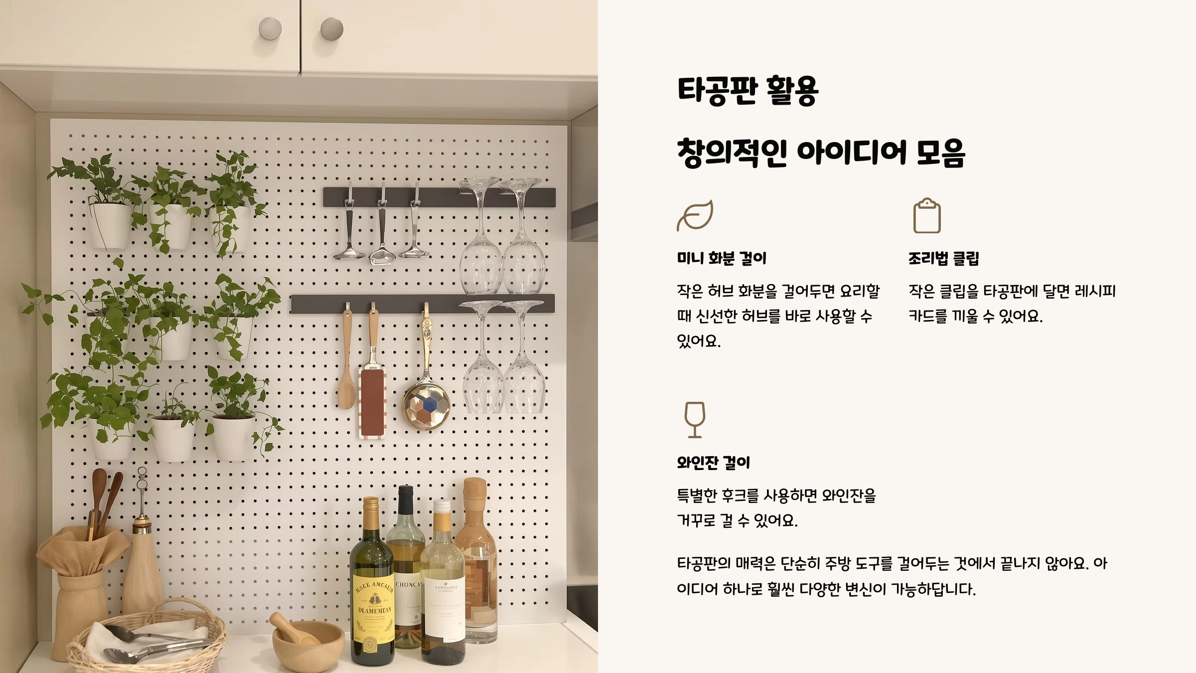 무엇보다 요리할 때 도구를 찾느라 서랍을 뒤적이는 스트레스가 사라졌어요. 모든 게 눈앞에 보이니 요리 시간도 단축되고, 깔끔해진 주방을 보면 기분까지 좋아지더라고요. 타공판 하나로 주방의 실용성과 미관을 동시에 업그레이드할 수 있다니, 정말 놀라운 변신이 아닐 수 없어요!