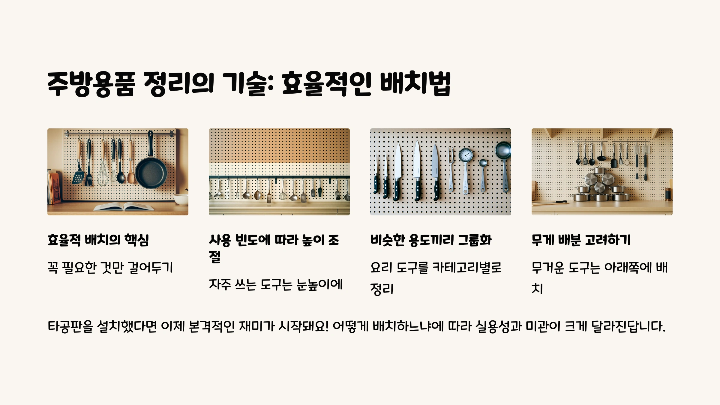 타공판을 설치했다면 이제 본격적인 재미가 시작돼요! 어떻게 배치하느냐에 따라 실용성과 미관이 크게 달라진답니다. 처음엔 막막했지만 몇 가지 원칙만 알면 누구나 예쁘고 실용적인 주방을 만들 수 있어요.