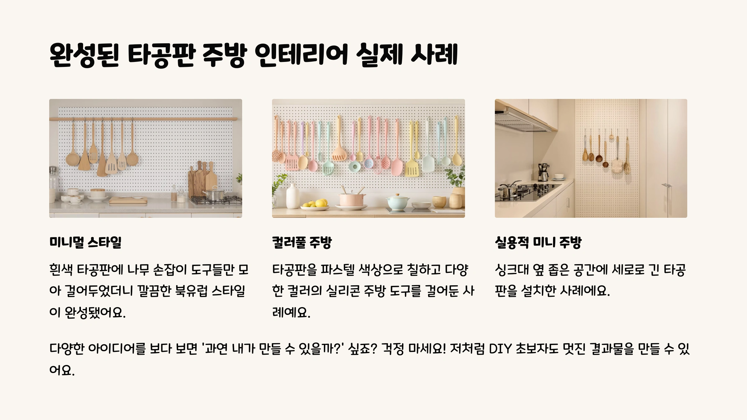 다양한 아이디어를 보다 보면 '과연 내가 만들 수 있을까?' 싶죠? 걱정 마세요! 저처럼 DIY 초보자도 멋진 결과물을 만들 수 있어요. 제가 직접 타공판으로 주방을 꾸민 사례와, 블로그나 SNS에서 찾은 영감을 주는 사례들을 소개할게요.