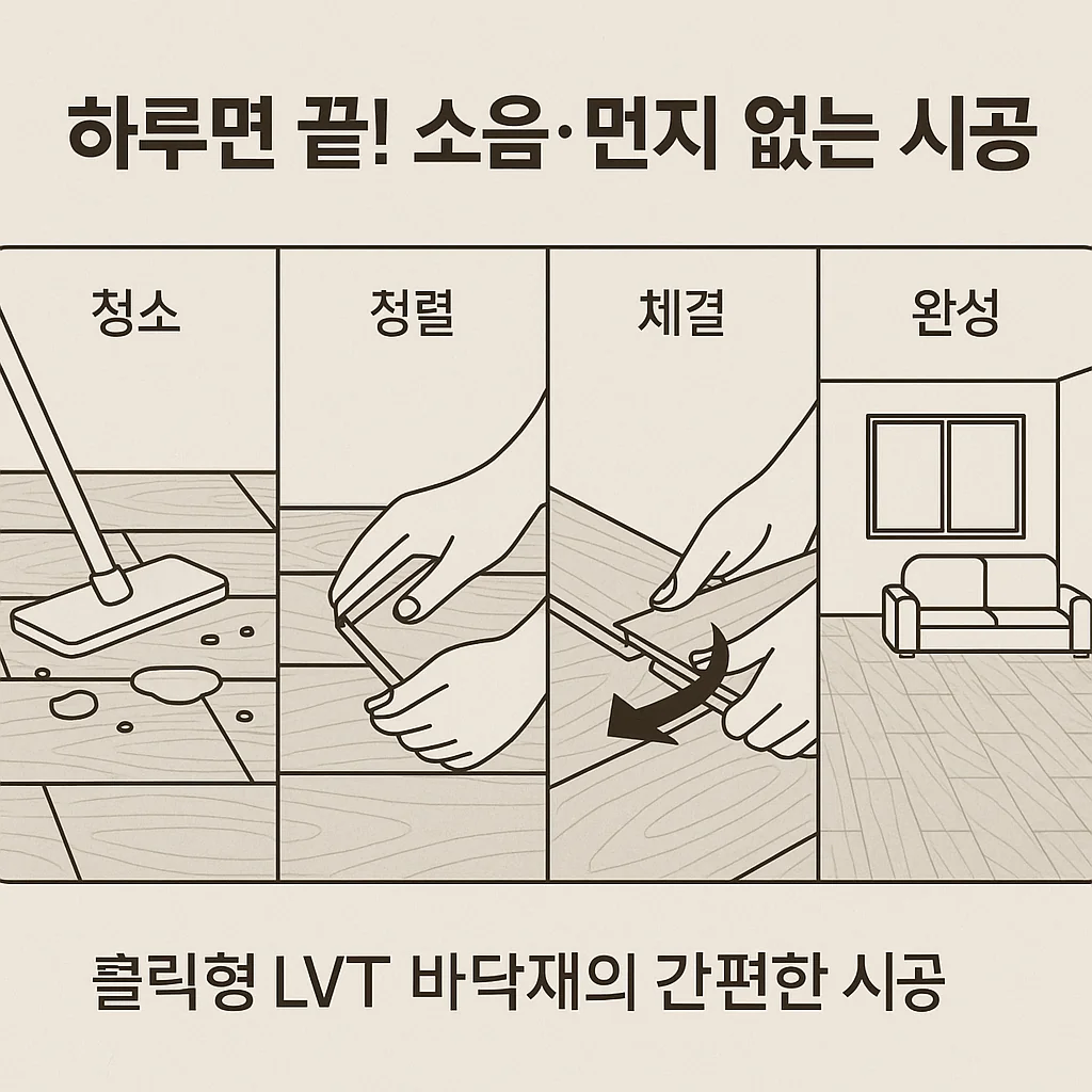 LVT는 시공 방식에 따라 다르지만, 일반적으로 클릭형 제품의 경우 기존 마루 위에 덧방 시공이 가능하여 철거 소음이나 분진 없이 비교적 빠르고 간편하게 시공을 마칠 수 있습니다. 30평대 거실 기준, 보통 하루면 충분합니다.
