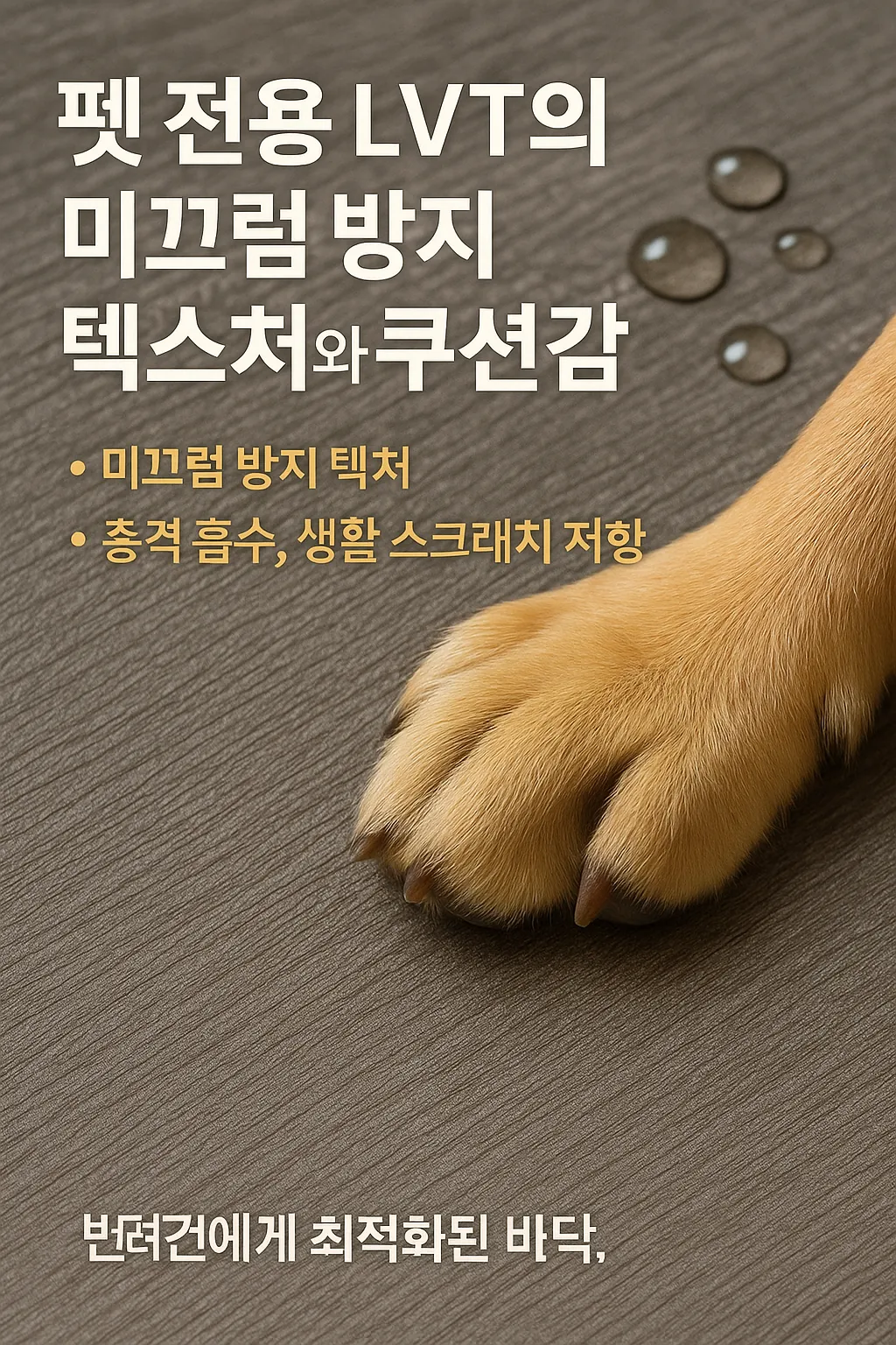 - ✔️탁월한 미끄럼 방지 성능: 펫 전용으로 출시된 LVT 제품들은 반려동물의 발바닥 패드와 발톱 구조에 맞춰 표면 텍스처가 설계되었습니다. 물기가 있는 상태에서도 높은 마찰력을 유지해 반려견이 안정적으로 보행할 수 있게 돕죠.