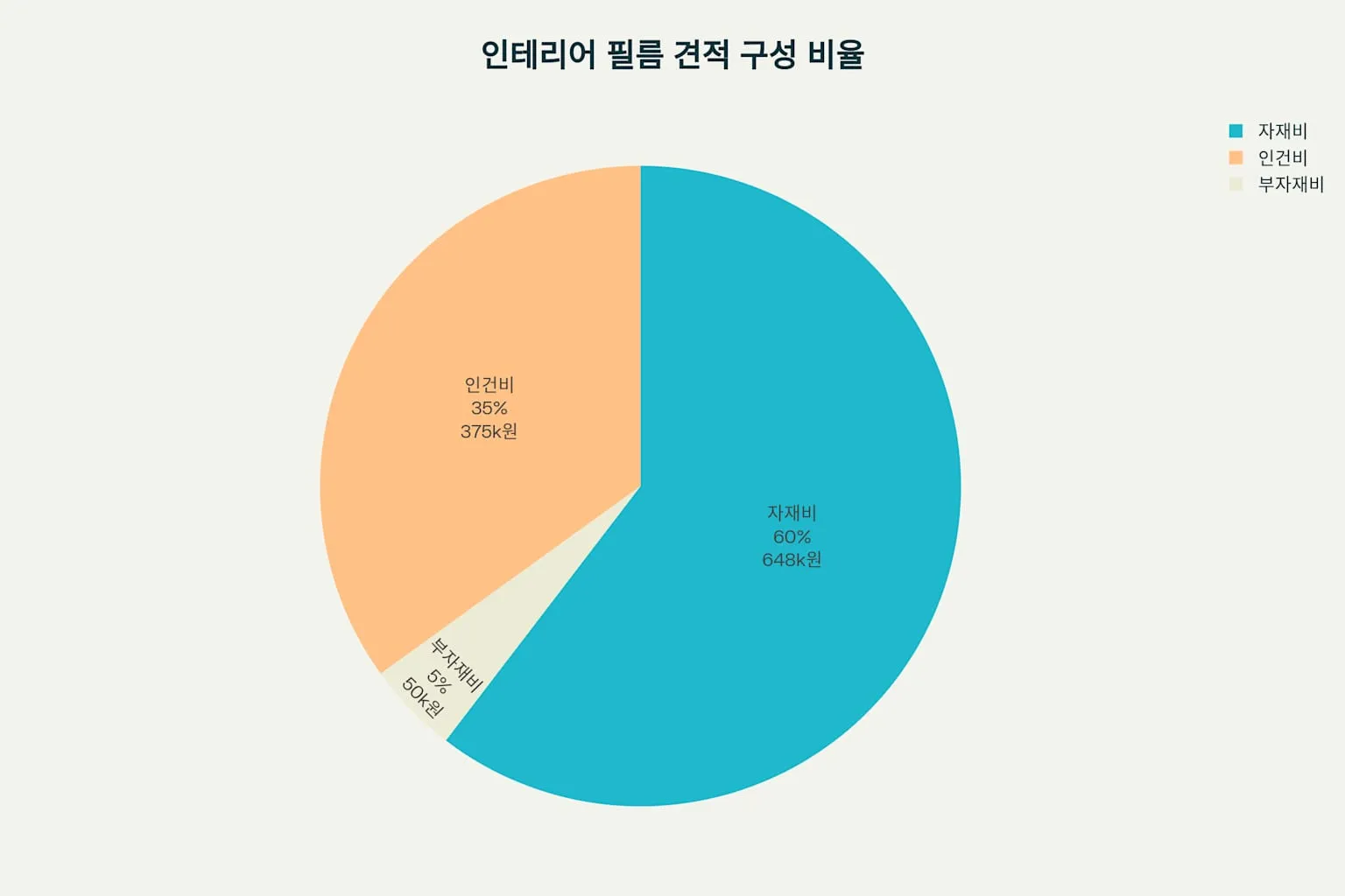 자재비 60%, 인건비 35%, 부자재비 5%로 구성된 인테리어 필름 시공 견적 구성 비율 원형 그래프
