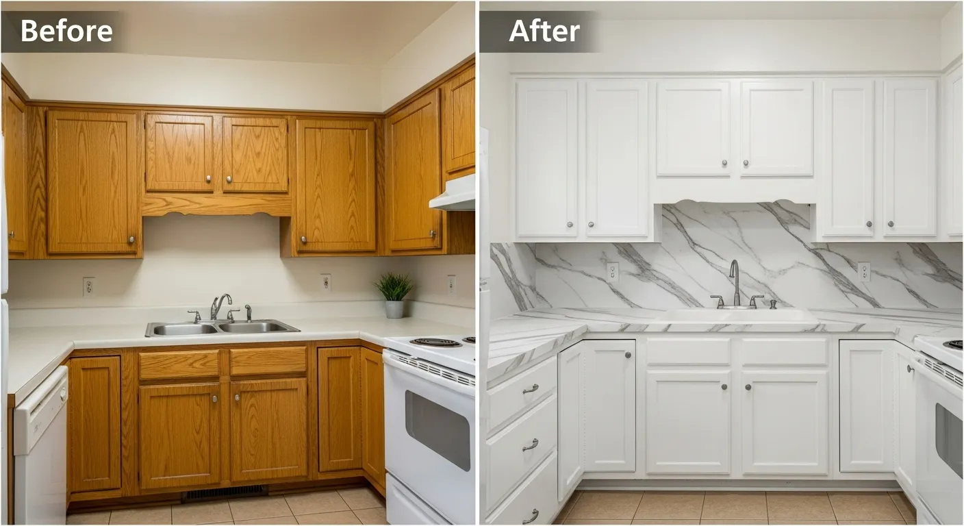 주방 리모델링 전후 비교, 우드 캐비닛에서 화이트 대리석 인테리어로 변신한 모습