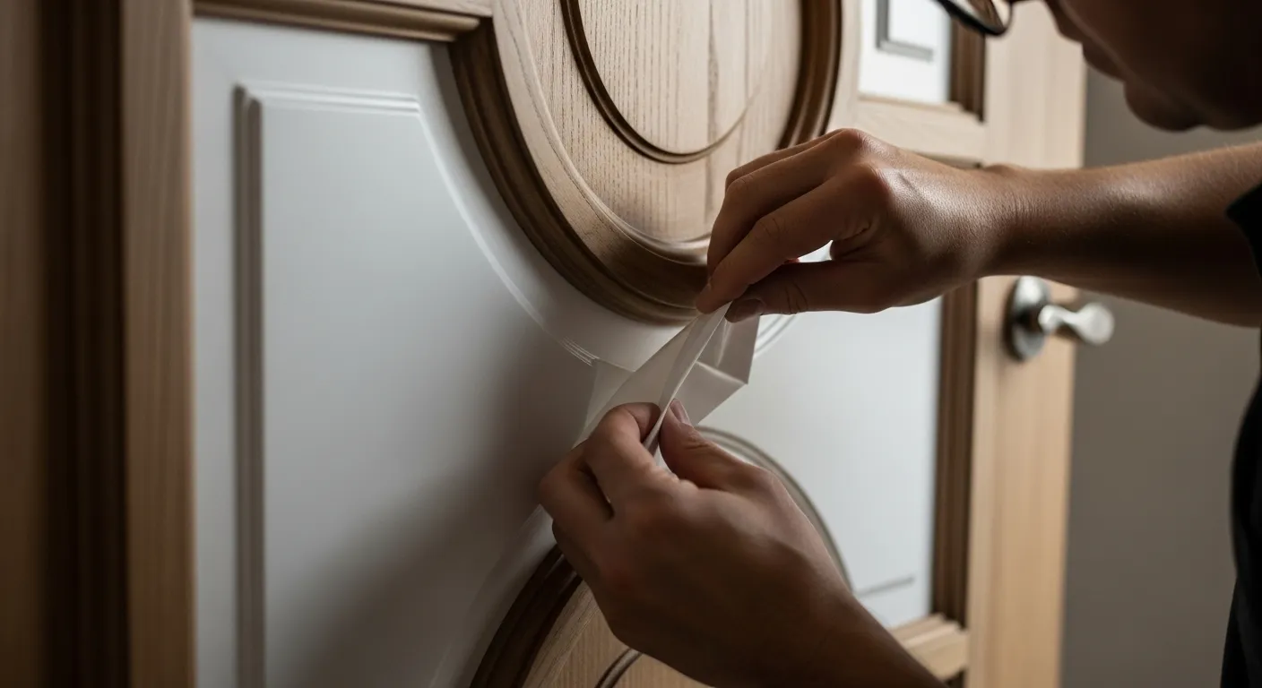 나무 문에 하얀 시트지를 정밀하게 부착하고 있는 손의 클로즈업 장면