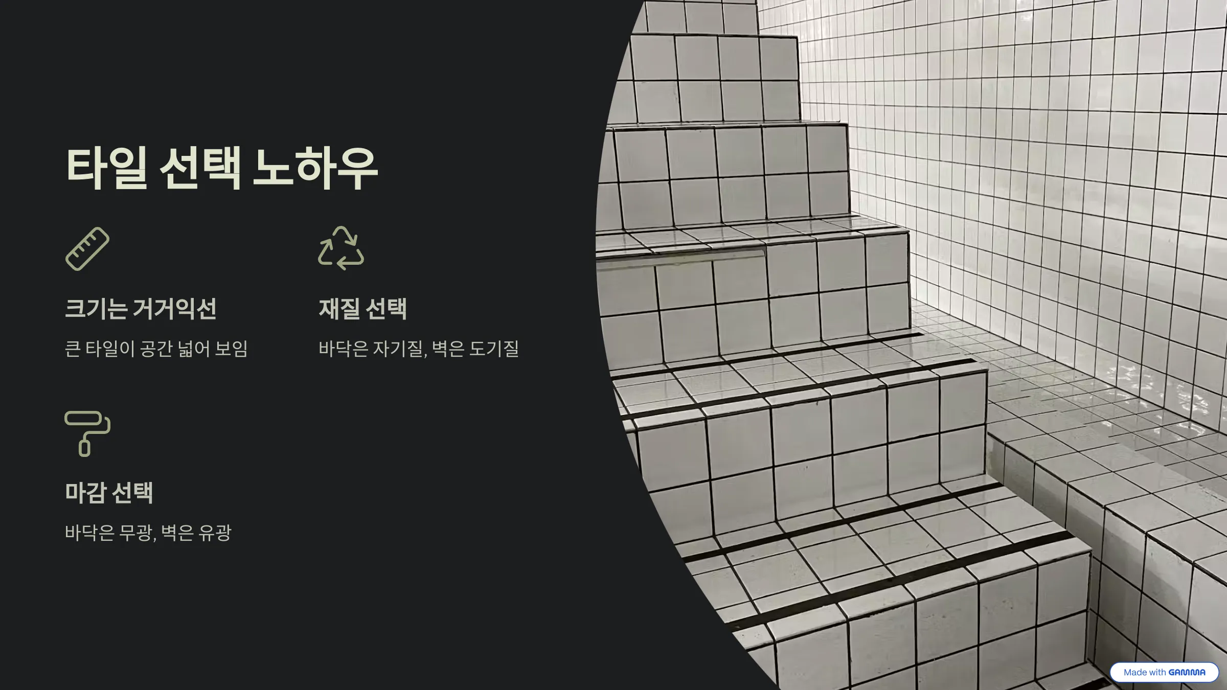 - 재질은 똑똑하게: 바닥 타일은 물 흡수율이 낮고 튼튼한 '자기질' 타일을, 벽 타일은 가공이 쉽고 색상이 다양한 '도기질' 타일을 사용하는 것이 일반적이에요.