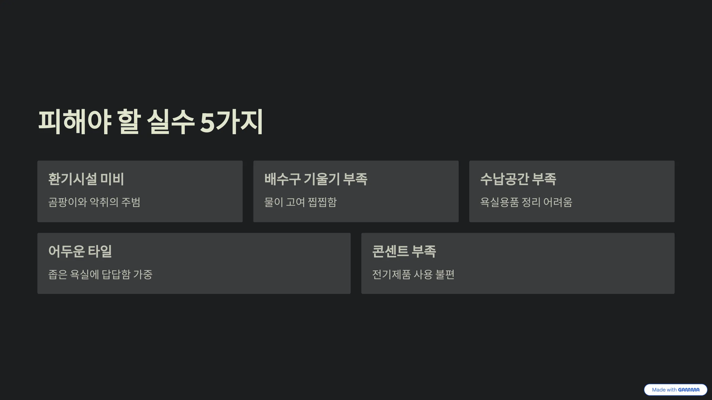 - ❌ 실수 1: 환기시설(환풍기)에 투자하지 않는 것. 곰팡이와 악취의 주범! 힘 좋은 환풍기는 선택이 아닌 필수입니다.