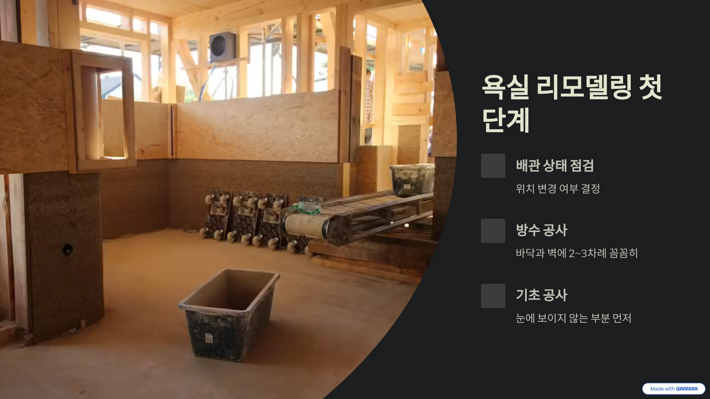 - ❌ 실수 2: 바닥 배수구의 기울기(구배)를 제대로 잡지 않는 것. 물이 고이고 잘 빠지지 않아 늘 찝찝한 욕실이 됩니다.